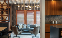 The project, overseen by Barker Architecture Office, was guided by a palette that featured a neutral backdrop of white tones and white oak elements in shapes and textures punctuated by washes of yellow and touches of blue. Instead of moldings and traditional paneling, detail comes from tambour oak millwork, reeded glass, textured plaster and terrazzo surfacing.