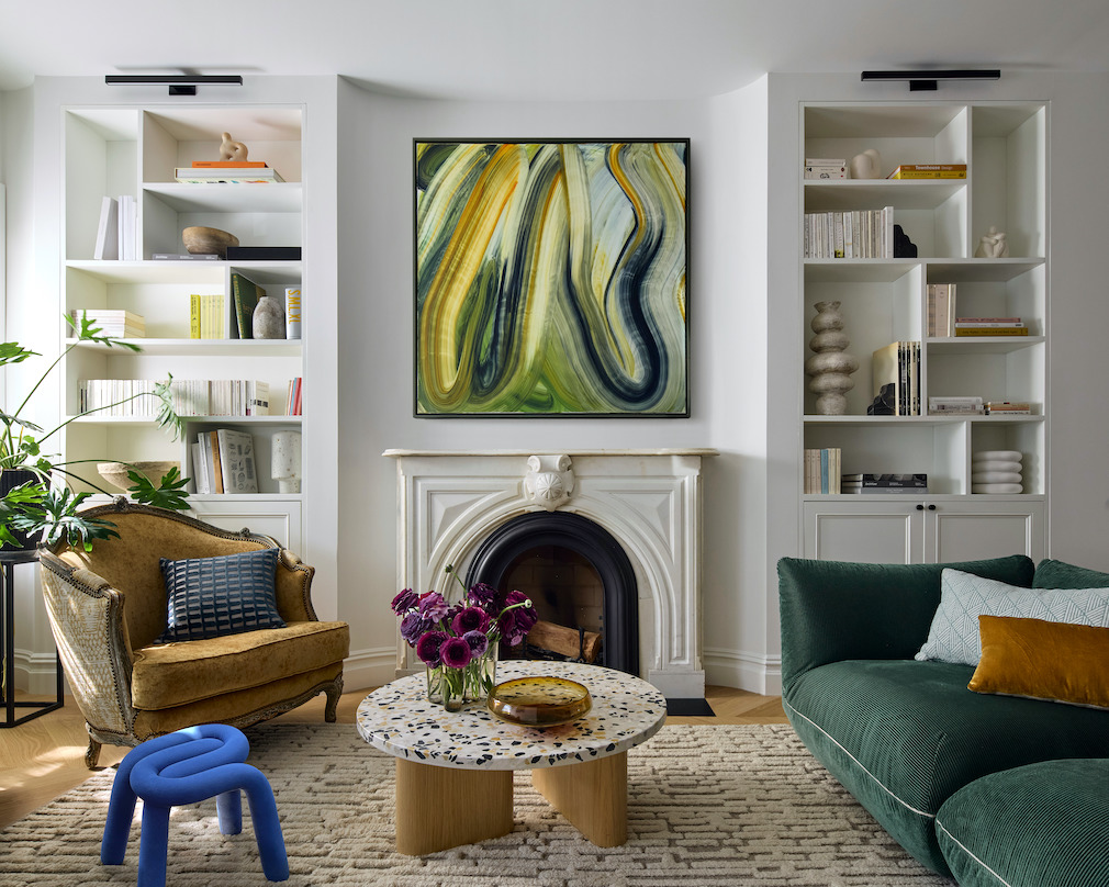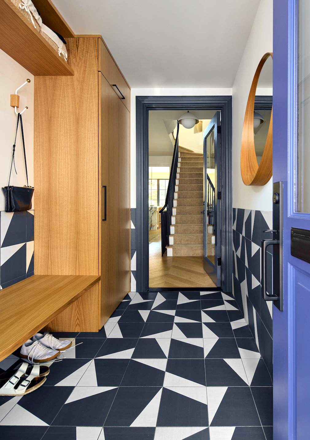 The entry was lined in blue and white patterned tile and sized to accommodate strollers with a custom bench and cabinet to provide storage. Inside, the parlor floor layout was deliberately kept open to make it easy to keep an eye on the children. Custom built-in and freestanding millwork pieces provide visual and material continuity.