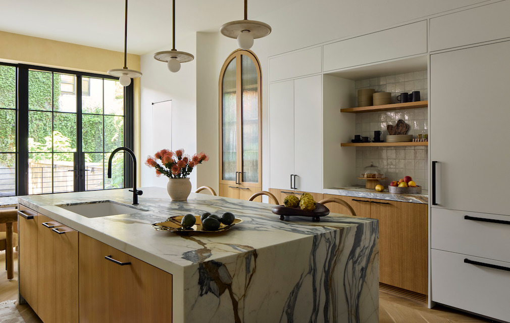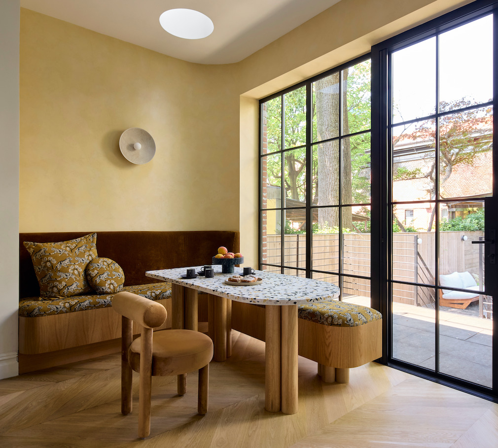 The kitchen features higher ceilings thanks to the decision to raise the floor at the back of the house to maximize the space a light leading toward the garden. A reeded glass and oak cabinet and Arabescato antico marble countertops built-in upholstered banquette and terrazzo table is defined by the backdrop of a yellow plastered wall and steel windows looking out into the garden.