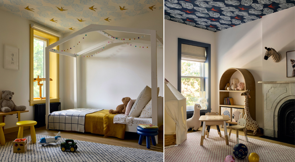 On the top floor, the kids’ rooms feature ceilings surfaced with wallpaper featuring graphic birds and clouds and finished with painted trim to match. The skylit bathroom is wrapped in yellow and white patterned cement tile. The stair is lit by a sculptural sconce by Lambert et Fils.
