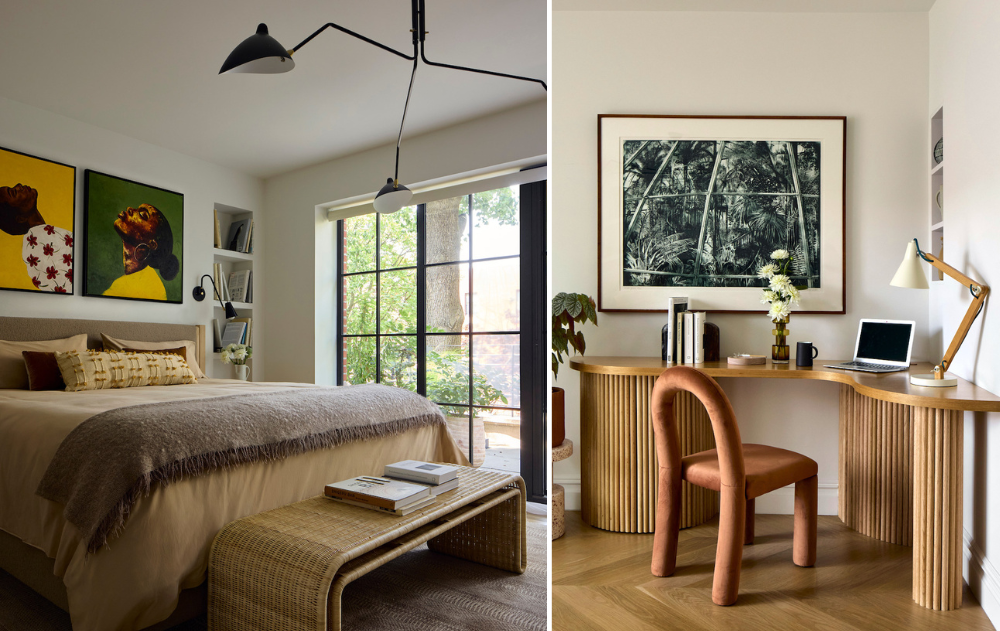 The second floor was configured as the primary suite. There, the steel bedroom window wall opens out into a private terrace. A custom corner desk provides space to work from home. The bathroom is finished in plaster, with a working fireplace, freestanding tub, and arched steam shower.