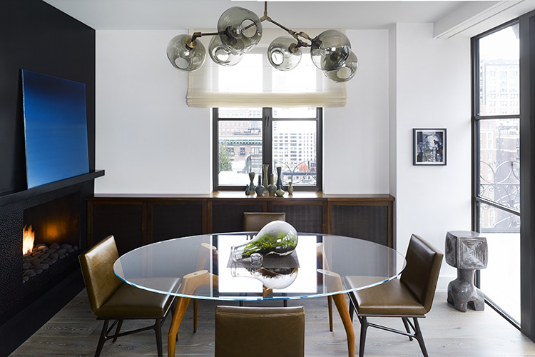 Leading into the small dining area, Nahem says he chose sparkling glass to project a bit of glam. The six-globe chandelier illuminates a circa-1960s glass-topped table with sculptural walnut base attributed to 1950s design icon Domenico “Ico” Parisi, while the chairs were brought from the client’s previous home and reupholstered in waxed leather. The bright blue painting propped on the mantel brings the living room’s Scandinavian chair into the fold, amplifying the fluidity of the entire space.