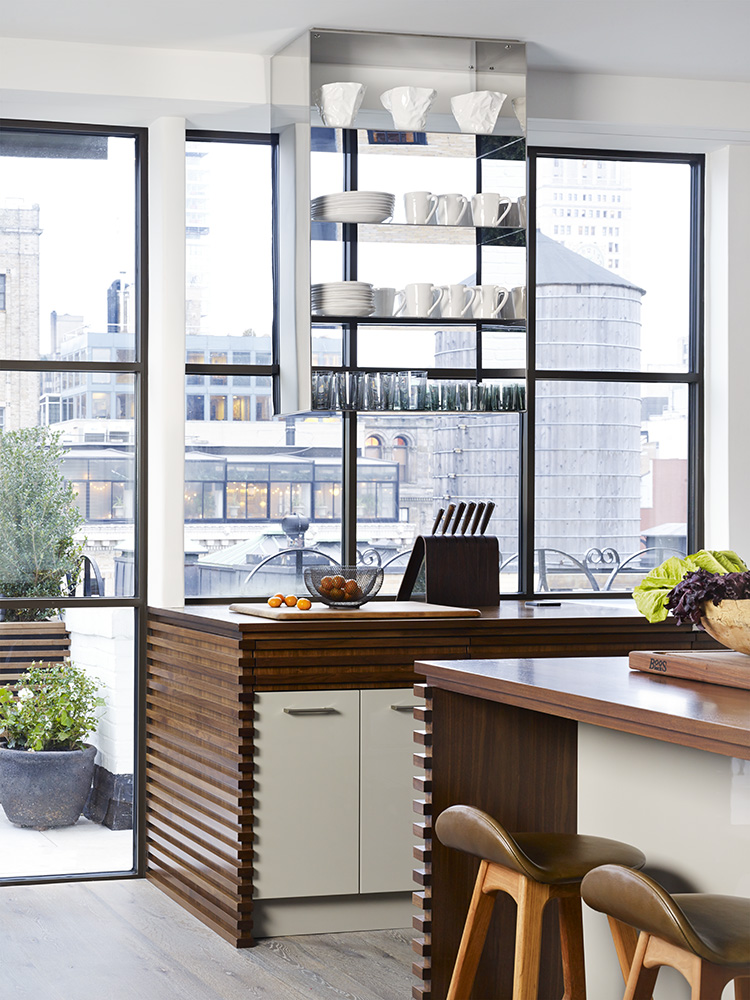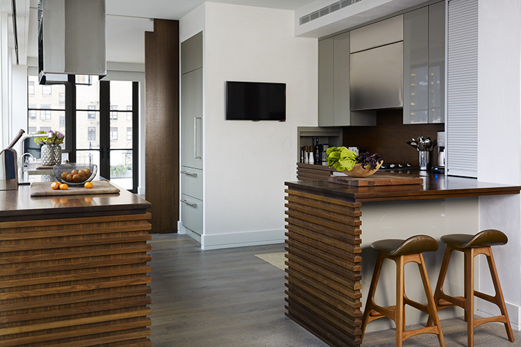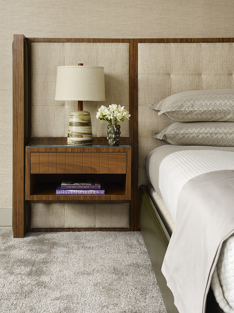 Rather than leaving the kitchen’s lacquer and walnut Wood-Mode cabinetry as is, the designer crenellated or notched the wood’s surface horizontally, creating both visual and tactile interest. Furthermore, in the master bedroom, he combined a walnut bed frame, including side tables with cotton/linen wall and headboard upholstery and a leather base. In the walk-in closet, it’s walnut through and through, with just the simplest brass accents.