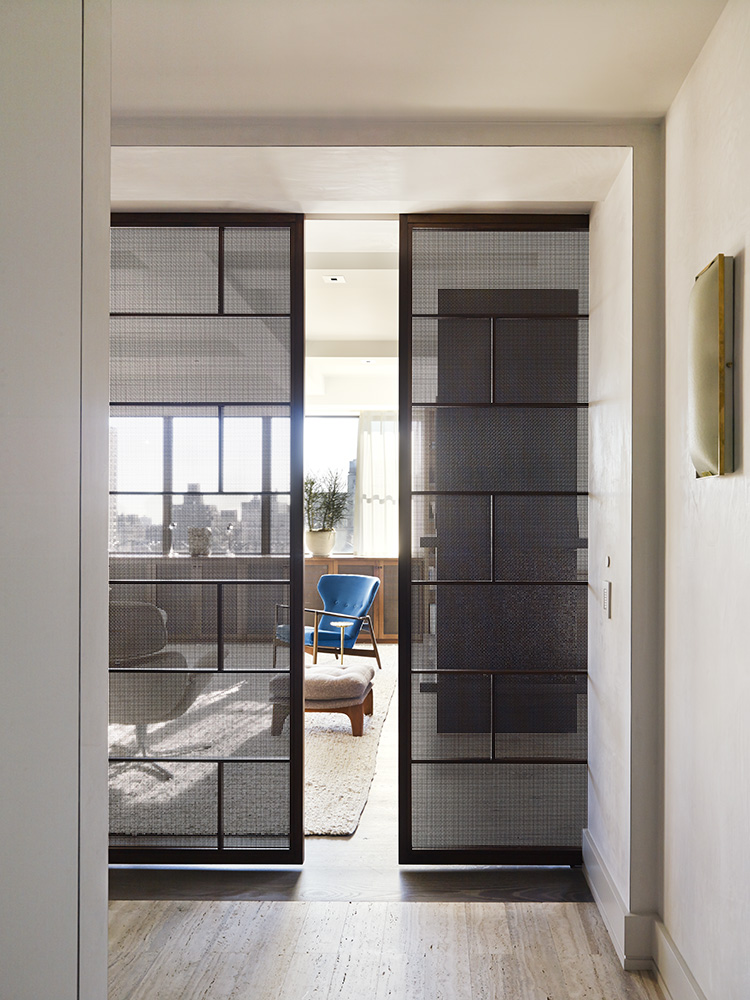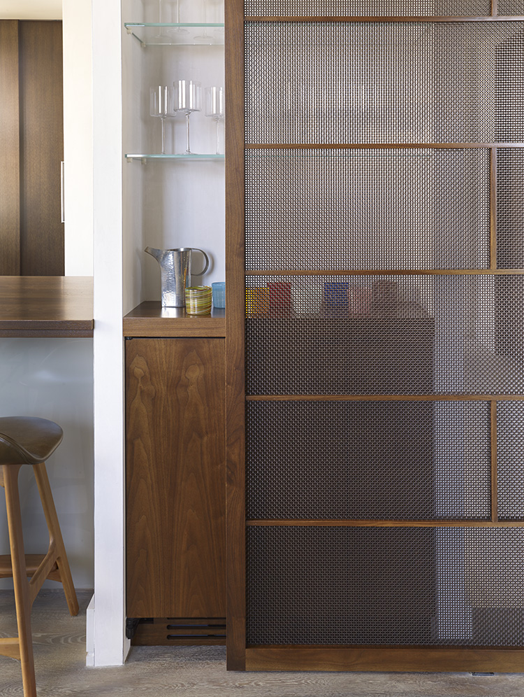 Walnut is used extensively throughout, but each application is approached differently. Personally designing much of the furniture for the apartment, Nahem says the walnut and bronze mesh screens were among the most satisfying to take form because they are both useful and handsome. They close off spaces as needed, hide storage and a bar, and add texture. They also intimate a luxurious kind of masculinity.