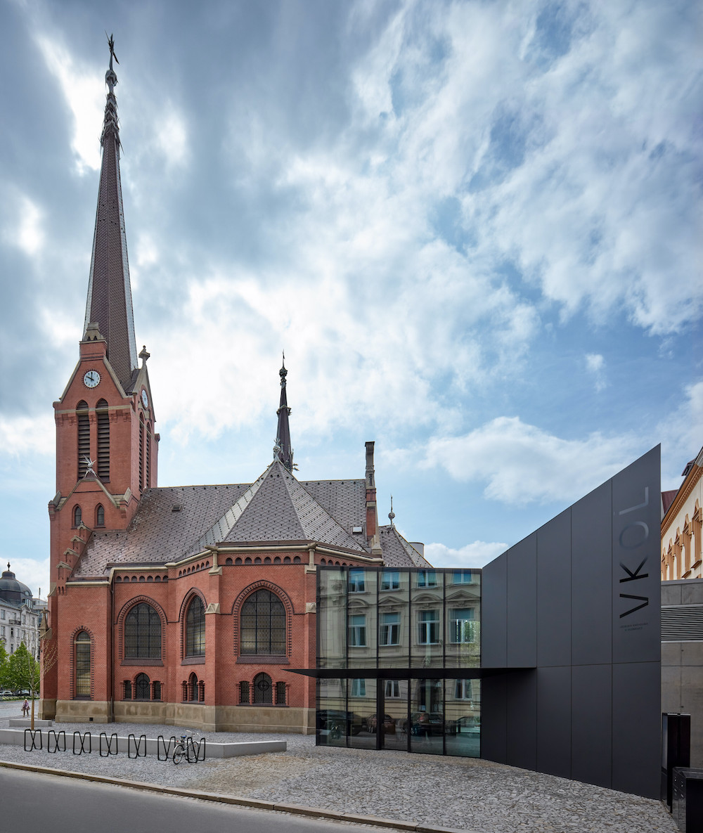 A stately, neo-Gothic structure, this Red Church in Olomouc Czech Republic has been utilized as a book depository by the Olomouc Research Library since 1959. During all those years, the landmark was completely closed to the public. This year, Olomouc Region embarked on a total renovation of the property with a focus on community involvement; constructing a new library building to fulfill the storage needs and freeing up the Red Church for cultural purposes such as smaller concerts, public readings, lectures, or art shows. The result beautifully preserves the original historical building, while incorporating new cultural and social functions.