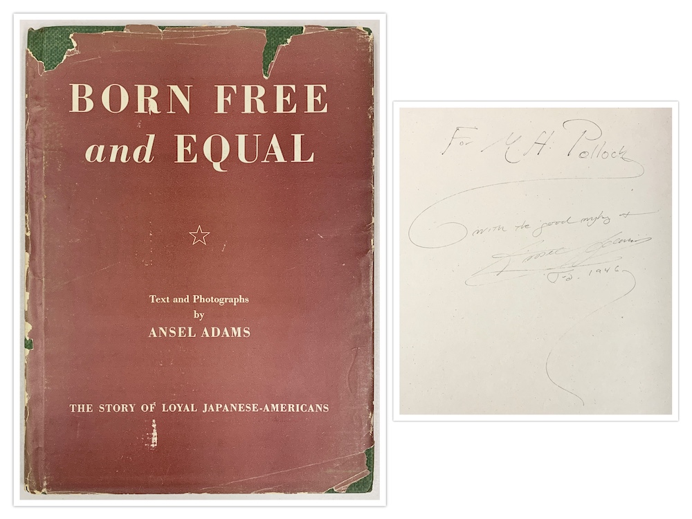 A first edition signed copy of “Born Free and Equal: Photographs of the Loyal Japanese-Americans at Manzanar Relocation Center Inyo County, California” by Ansel Adams. Through Old New York Book Shop.