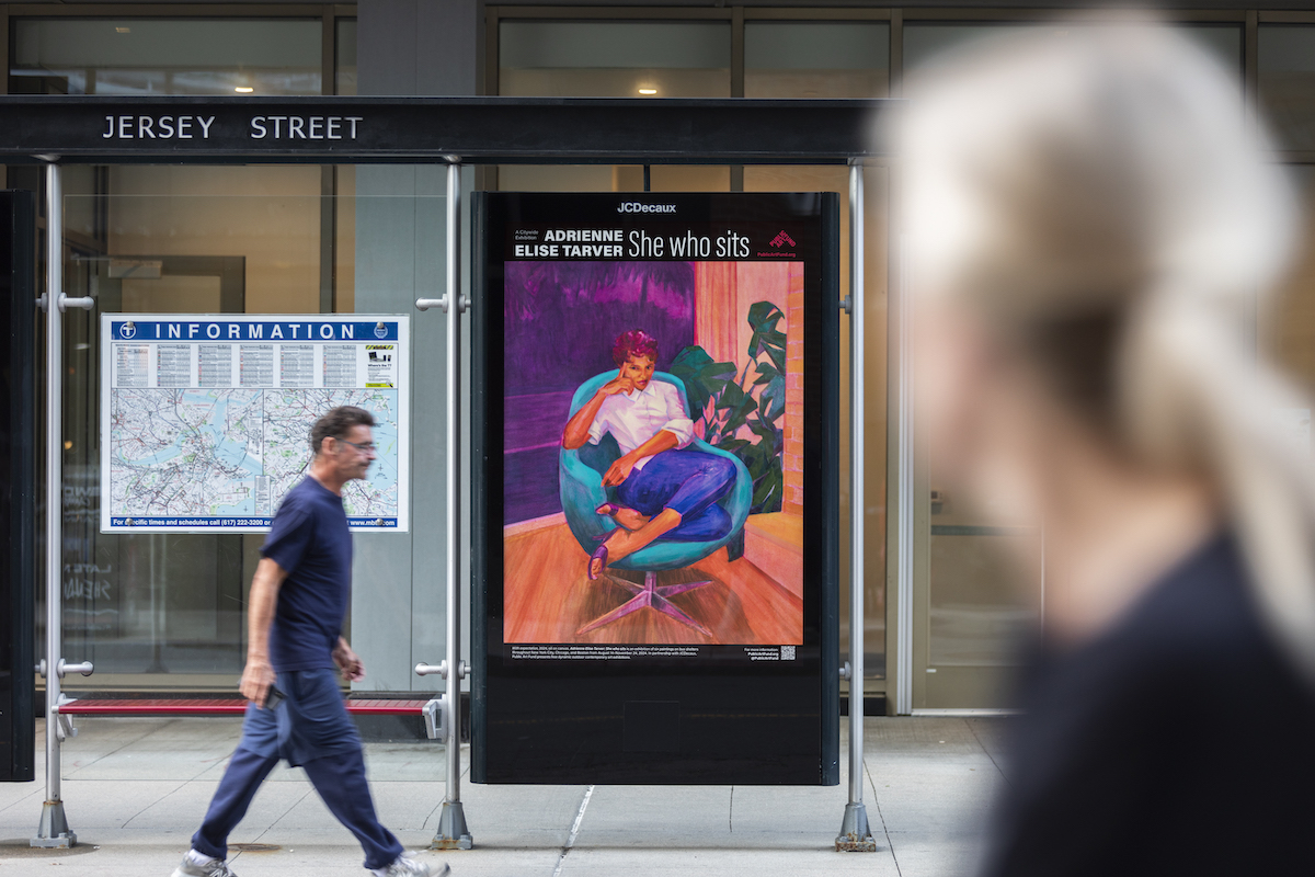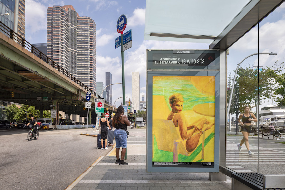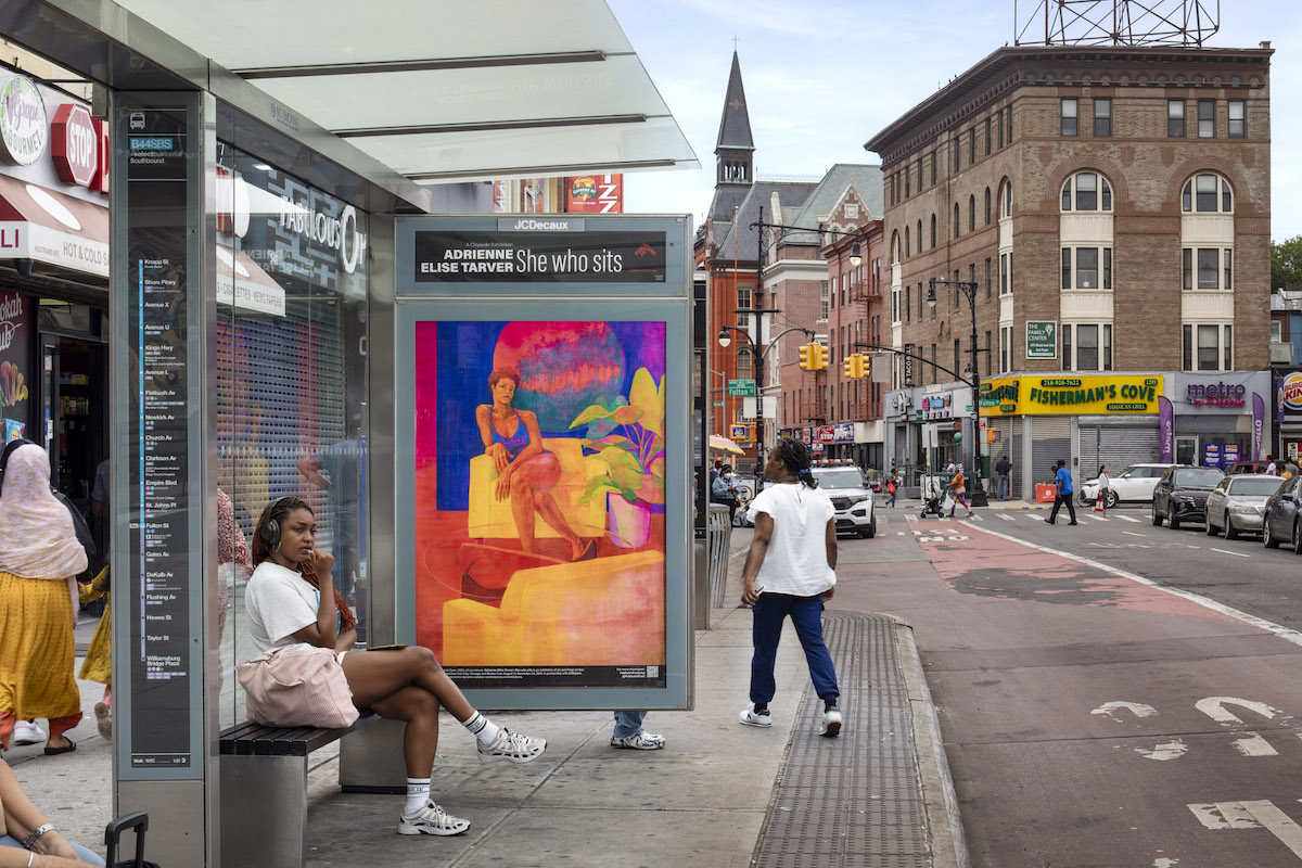 Adrienne Elise Tarver: She who sits, features six new images displayed on 300 bus shelters across New York City, Chicago, and Boston. Tarver’s newest body of work is an ongoing exploration of the centrality of the Black matriarchal figure, combined with new imagery where her subjects reject spectatorship, proclaim agency, and engage in self-affirming rest while seated in intimate environments.