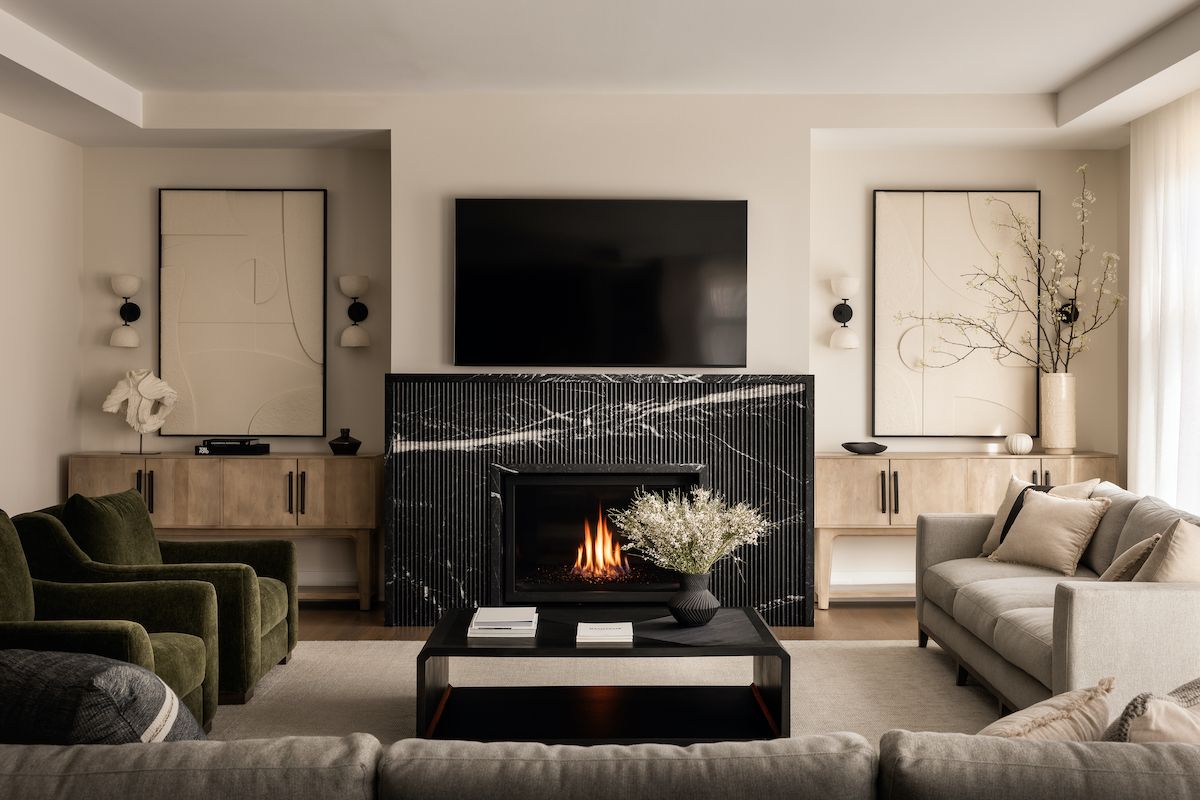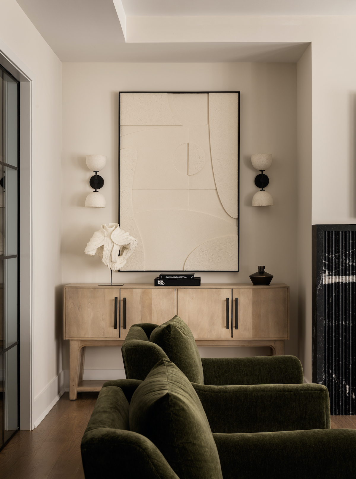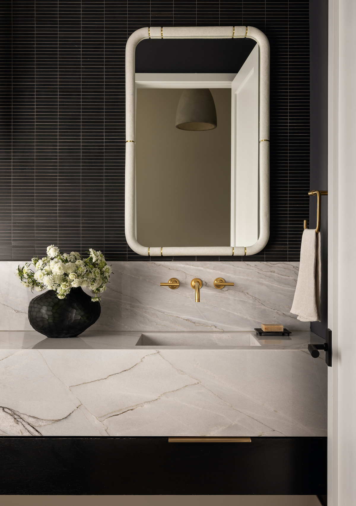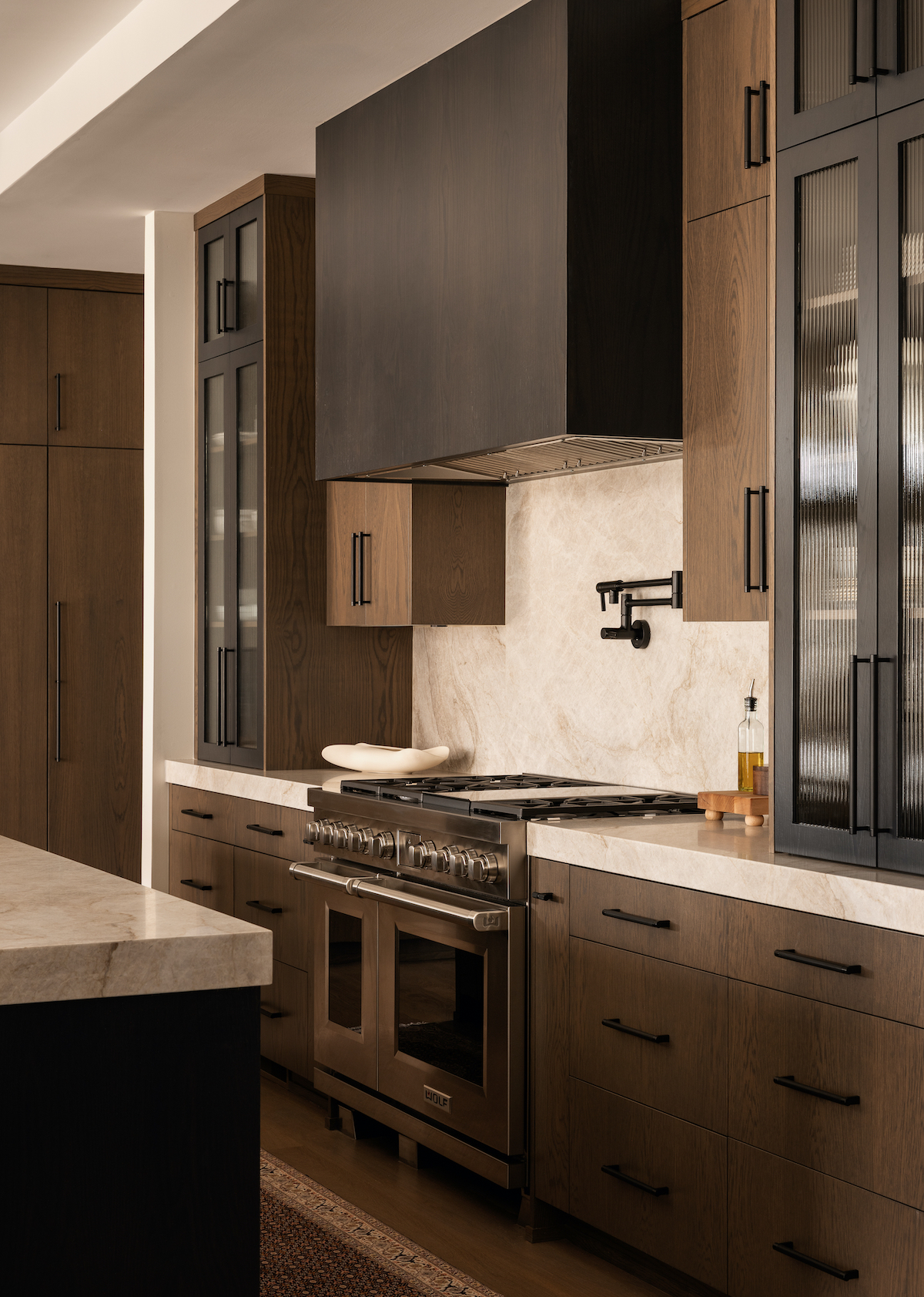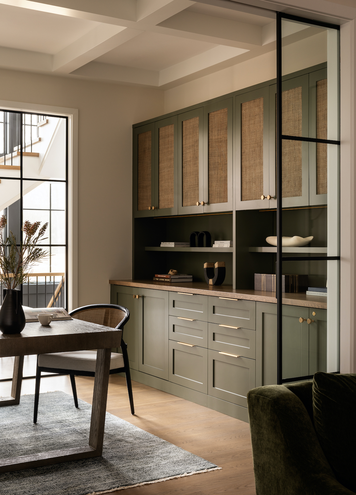 We didn’t want the home to feel monochromatic, so we carried touches of rich greens throughout. That and the warm woods we used nod to the exterior. We also used a mix of materials in the rooms to create layers and add small, but important, details. In the kitchen, Taj Mahal quartzite, reeded-glass cabinets and Visual Comfort pendants elevate the space. That’s the wife’s favorite room because it’s so inviting and functional.
