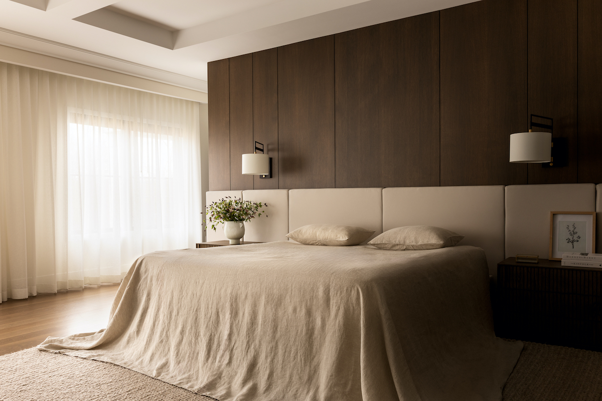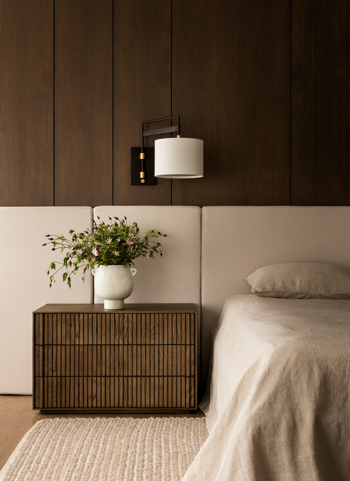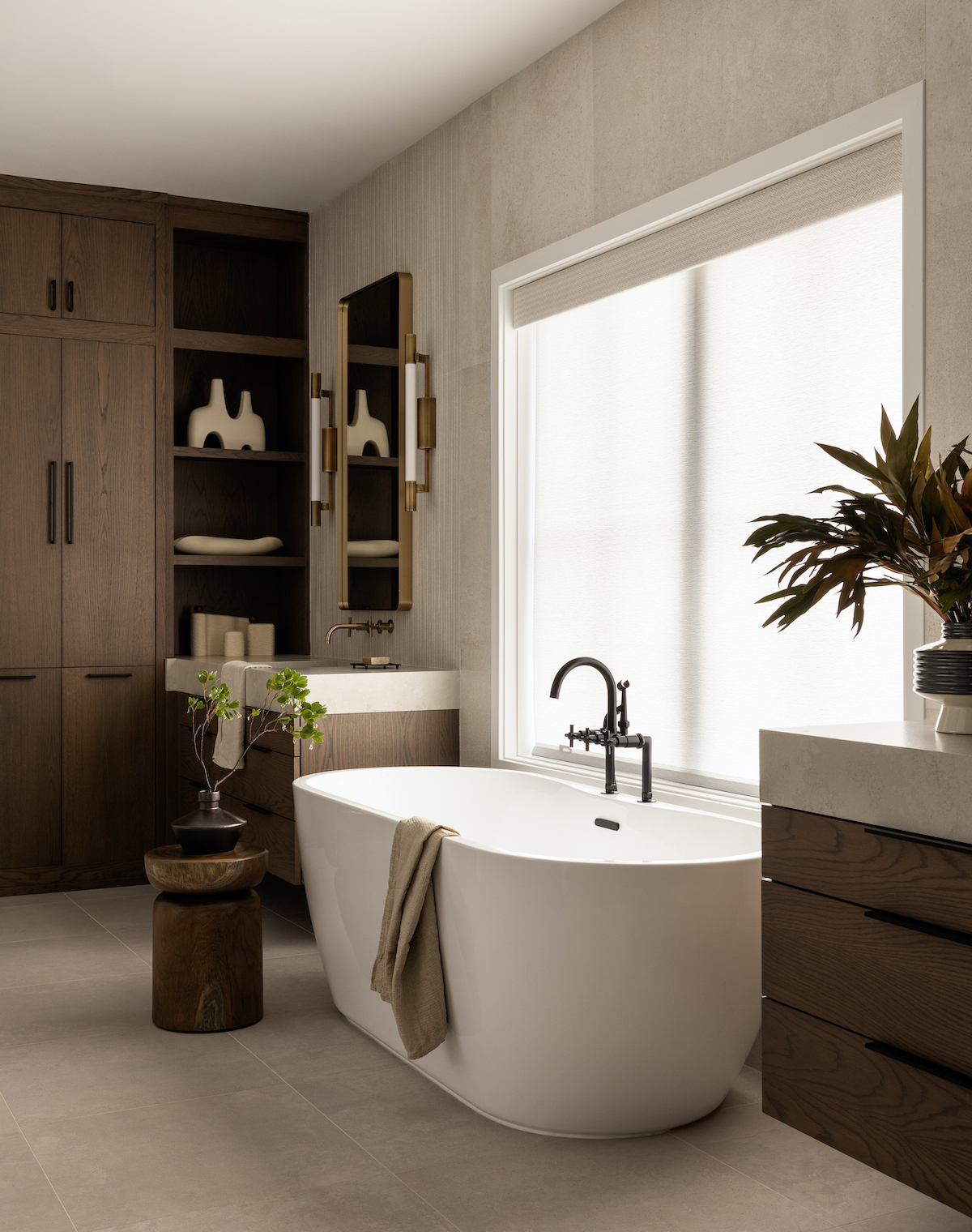 When you have young kids, you need a space to recharge, and the primary suite does that. I wanted the bedroom and bathroom to speak to each other. Both areas are custom-made, so we matched the wood stain throughout, as well as kept the tiles and the headboard in the same color family. I think that we created an oasis that allows the homeowners to disconnect from the busyness of their days.
