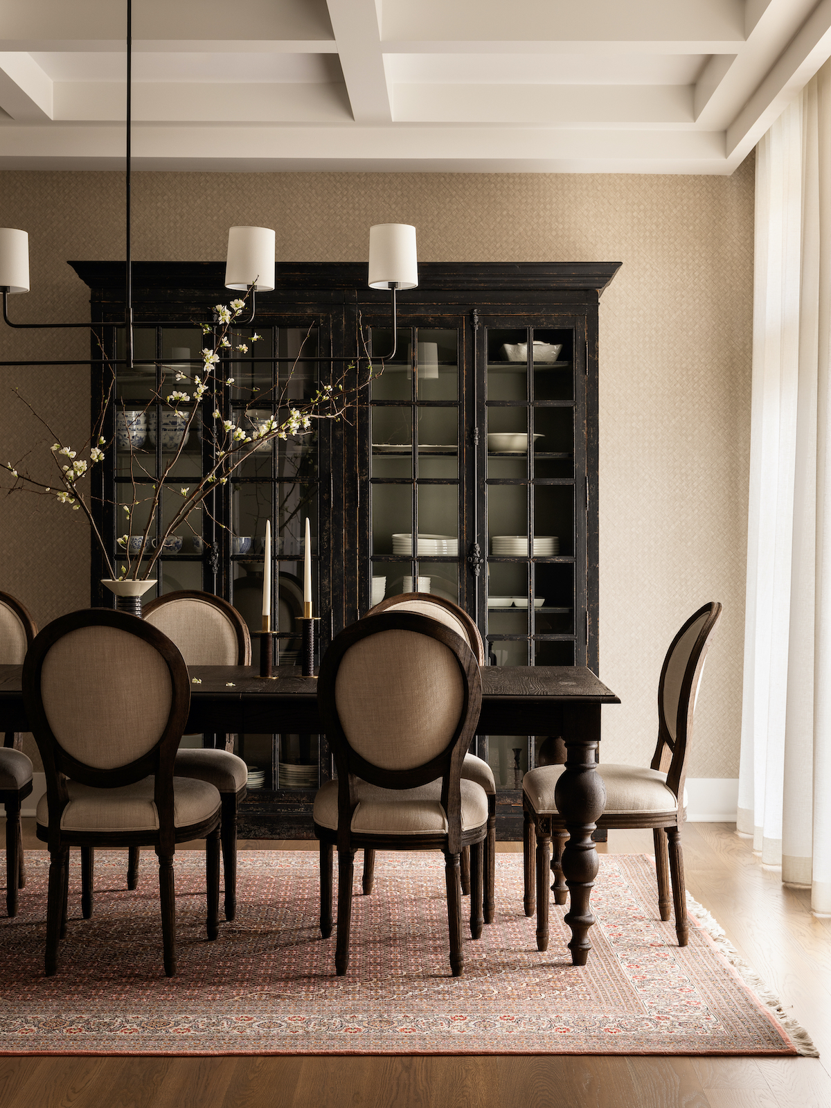 The dining room and family room are also very relaxed and rustic. Phillips Jeffries wallpaper envelops the dining room walls, creating texture. The Nero Marquina fireplace in the family room is very luxurious, but there’s a casual vibe to the space, where the whole family can pile on the comfy seating.