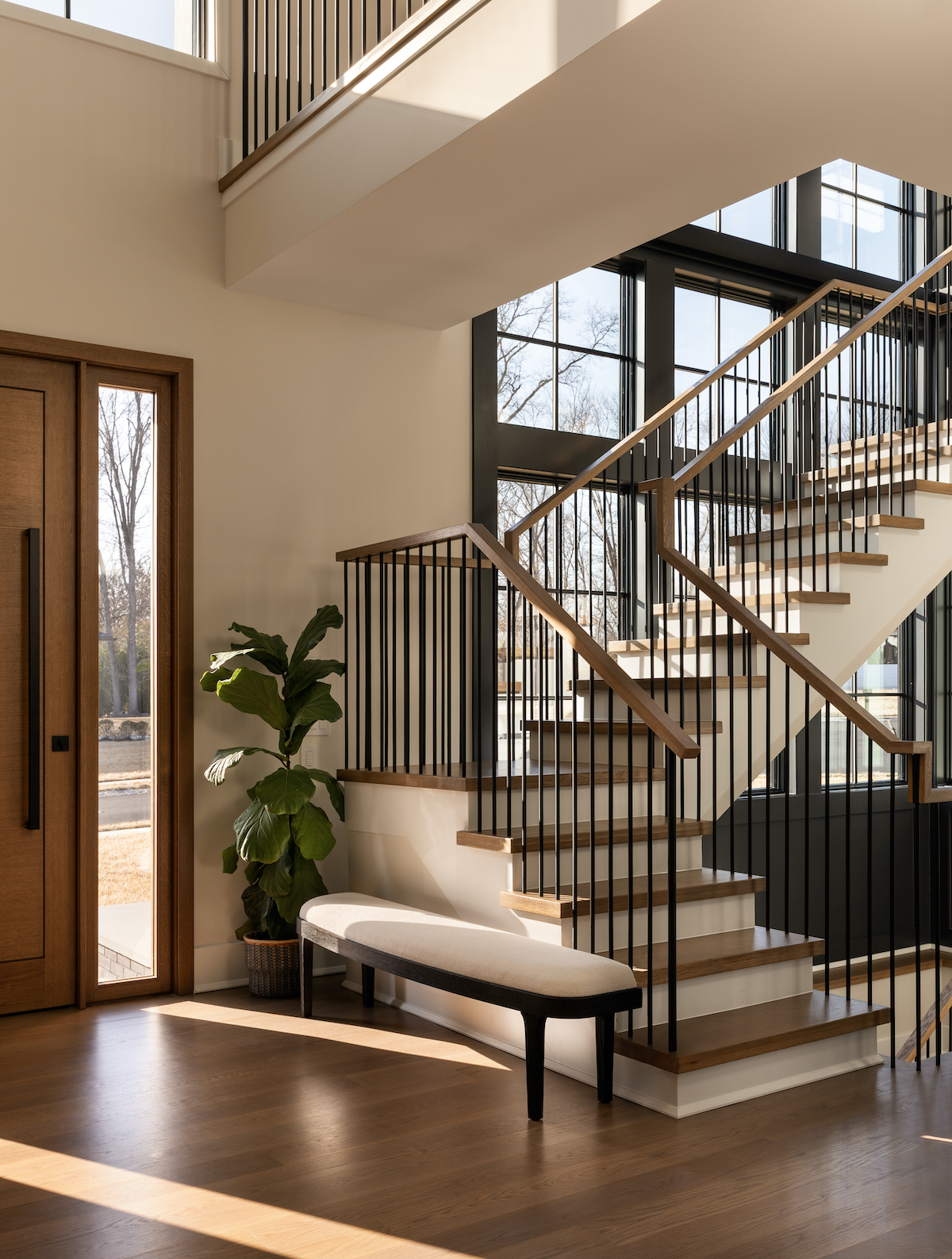 This aesthetic has been something I’ve wanted to execute, but it’s not something my regular clientele requests, since I’m known for modern design. This was an opportunity to work in a more traditional aesthetic, while still incorporating contemporary elements, such as the floating staircase. It’s such a statement piece that serves as a focal point that can be seen from the exterior and many rooms throughout the house.