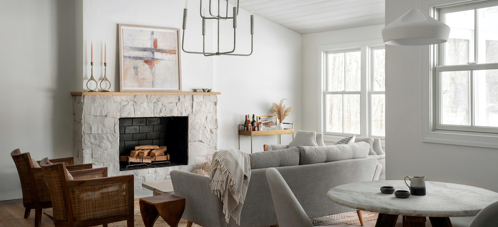 Drawing inspiration from the unique setting, Fields incorporated stone accents, earth tones and natural materials to reflect the landscape. As she explains, “I chose to paint the exterior white and include light-gray board-and-batten shutters to achieve a bungalow feel.” Collaborating closely with the landscaper, the team installed a pea-stone driveway and planted grasses and hydrangeas in keeping with its coastal location.