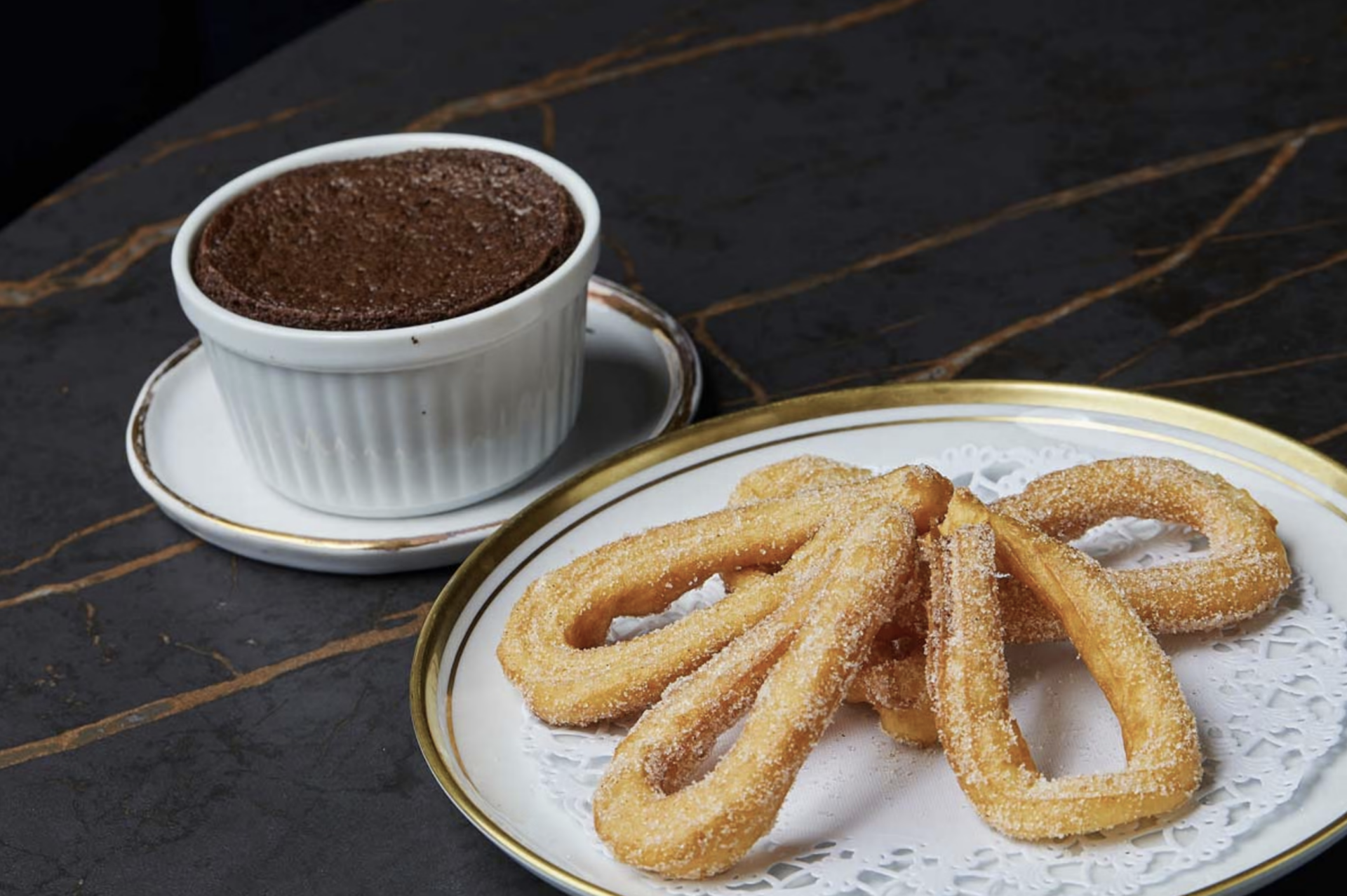 In a small saucepan, heat the water, oil, sugar, and salt. Bring to a boil, then remove from the heat and add the flour. Mix thoroughly with a whisk. Leave to cool and then add the eggs one at a time while mixing. Return to the heat and stir to ensure the mixture doesn’t stick. Pipe the churros using a piping bag with a star tip nozzle. Fry at 356ºF. Cover in sugar.