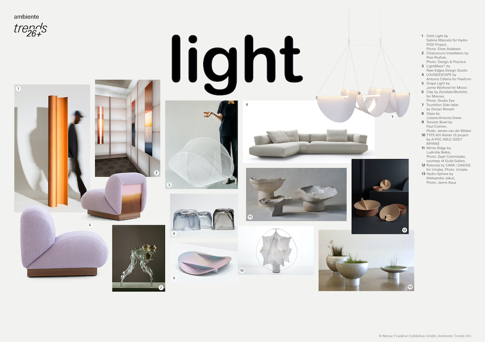 Light: Airy. Ethereal. Visionary. Light brings clarity and ease via flowing materials, pastel and metallic tones, and weightless designs that appear to shift energy from calm to vibrant.