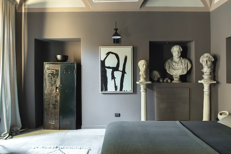 The bust-bedecked “Roman room” is outfitted with repurposed finds, including the large vitrine and metal locker.