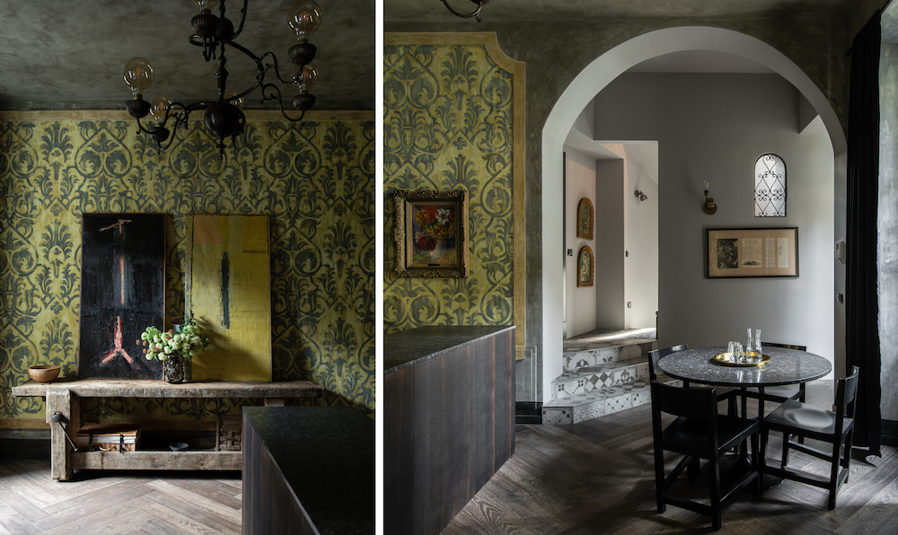 A hand-painted fresco – refreshed from the remnants of the original – envelops the kitchen and breakfast room. The natural light illuminates the Tulip table refurbished with dark marble to match the nearby countertops partnered with AVL Shaker chairs from Moooi.