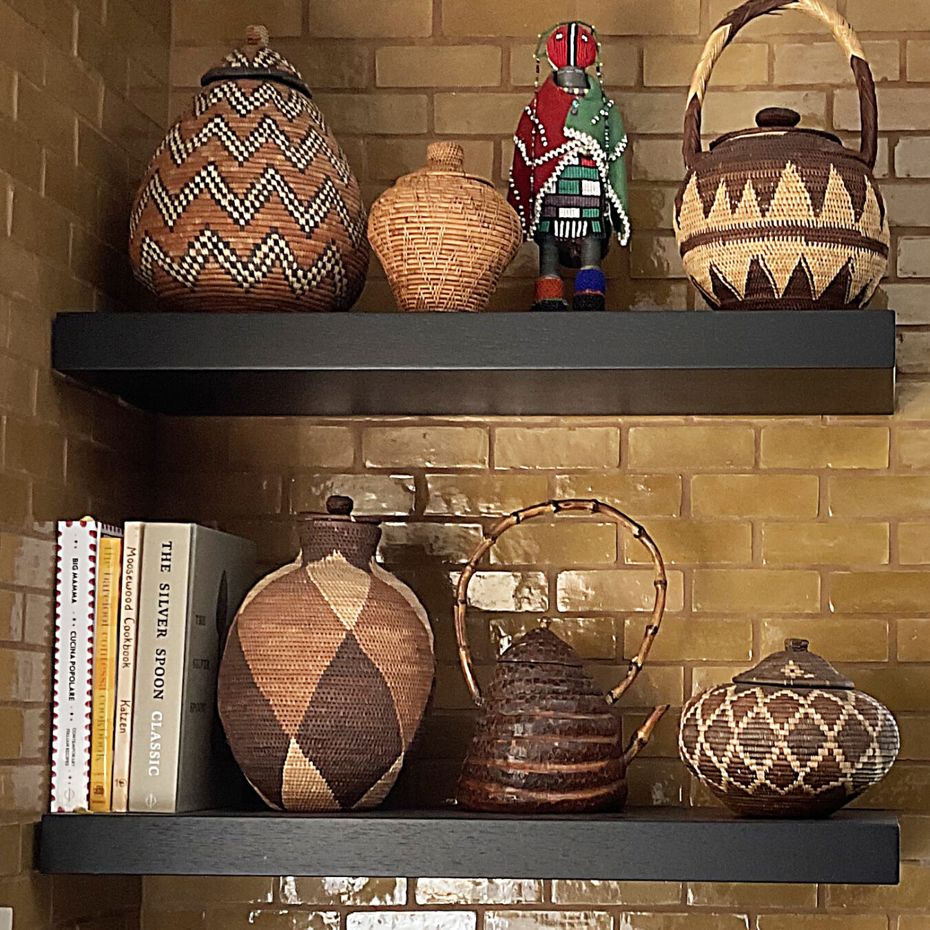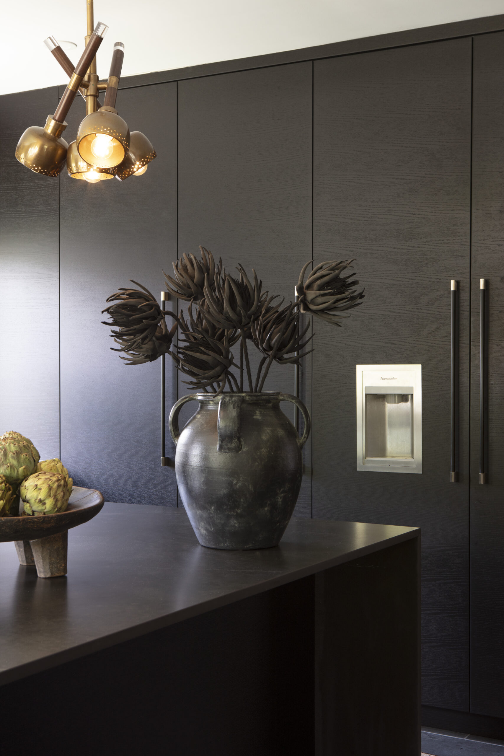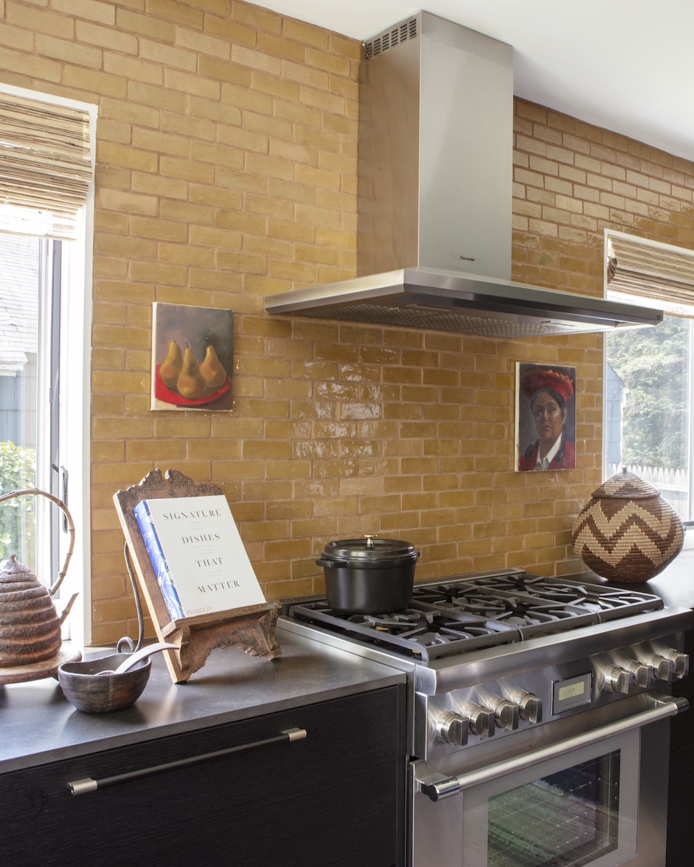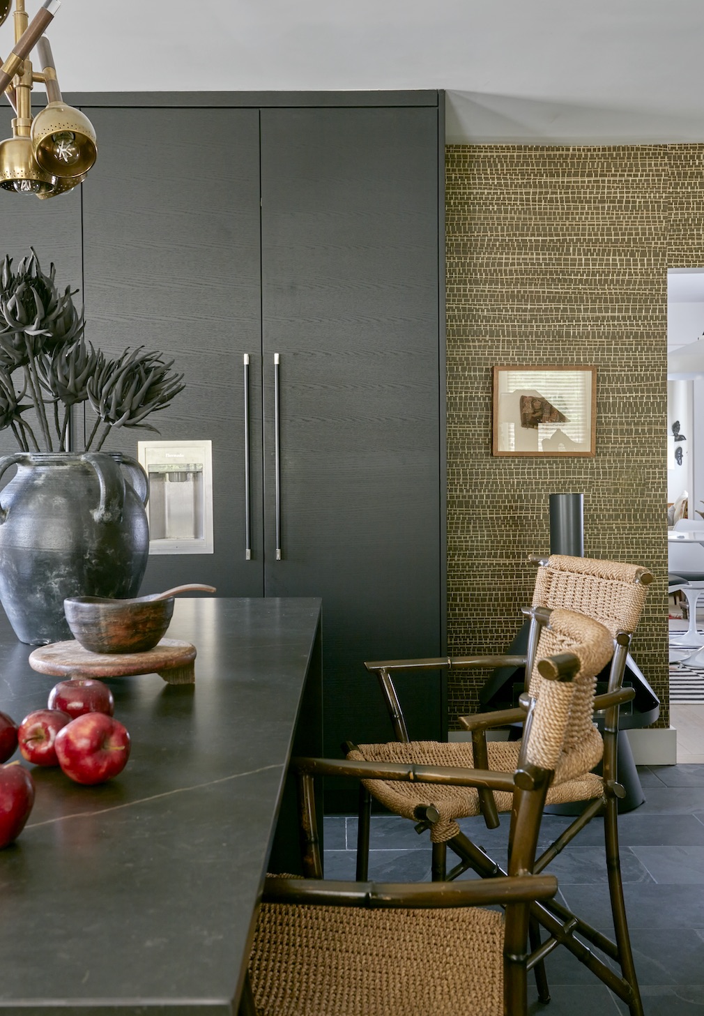 Moderna black lacquered oak finish integrated cabinetry: Florense; Countertops and island waterfall: Calatorao Matte Sintered Stone: Neolith; Pavo large pendants in vintage brass and dark walnut: Jay Jeffers Collection; Appliances: Thermador, Reno’s Appliance, Paterson, NJ; Kitchen sink and faucet: General Plumbing Supply; Moroccan Zellige tile backsplash in Cognac Brown: Cemento; Artisan weave window coverings: The Shade Store; South African Zulu basket collection; Vintage metal bamboo and rope counter chairs.