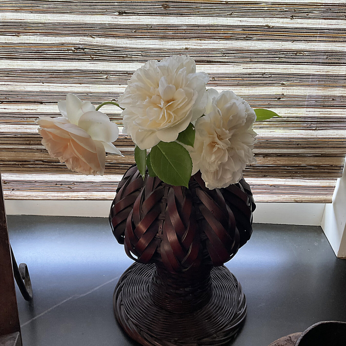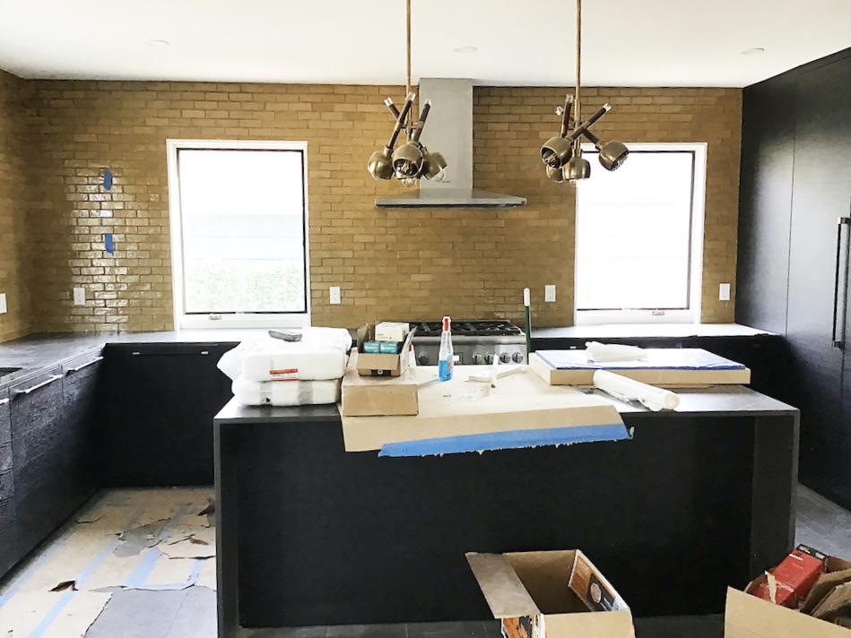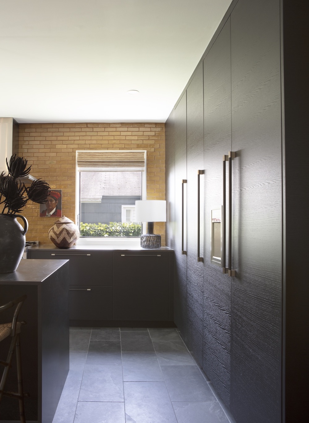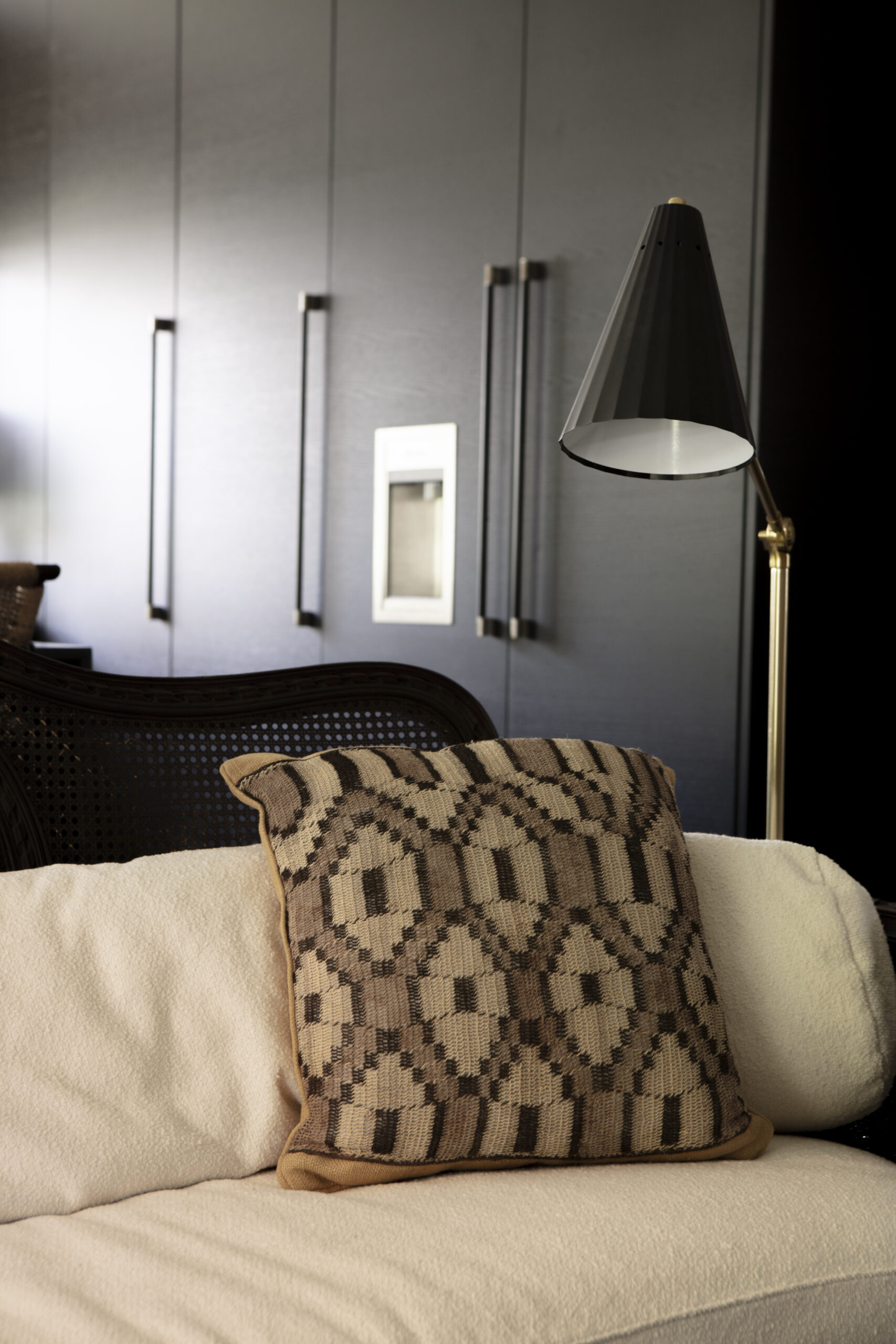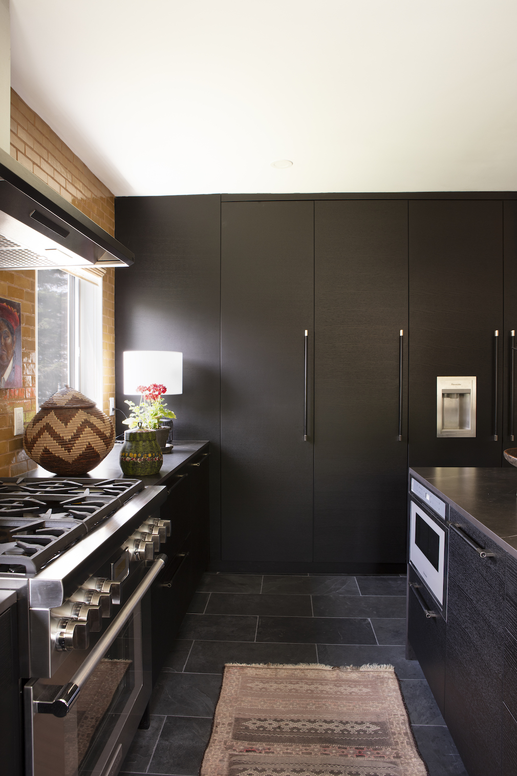 Moderna black lacquered oak finish integrated cabinetry: Florense; Countertops and island waterfall: Calatorao Matte Sintered Stone: Neolith; Pavo large pendants in vintage brass and dark walnut: Jay Jeffers Collection; Appliances: Thermador, Reno’s Appliance, Paterson, NJ; Kitchen sink and faucet: General Plumbing Supply; Moroccan Zellige tile backsplash in Cognac Brown: Cemento; Artisan weave window coverings: The Shade Store; South African Zulu basket collection; Vintage metal bamboo and rope counter chairs.