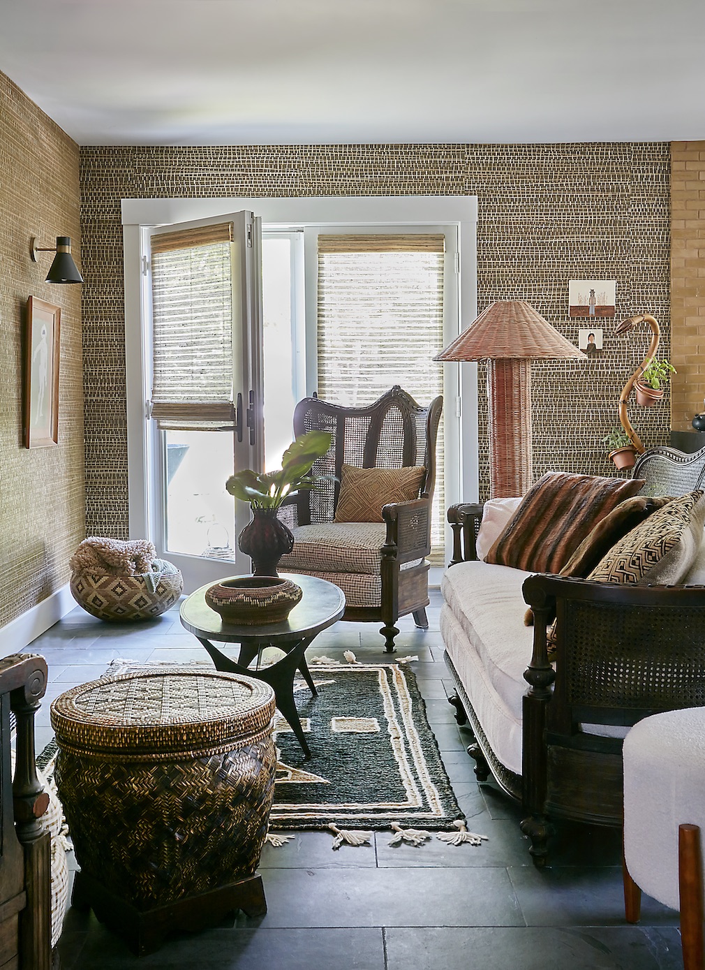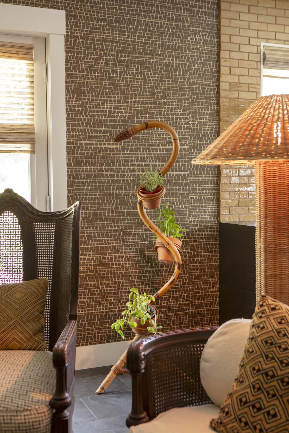 Les Forêts wallpaper collection in Ruban Pattern: Arte; Three-piece wood and rattan sofa and chairs: Newburgh Vintage Emporium; Chair fabric in Parterre – Golden: Suzanne Tucker Home; Sofa fabric in Dolcetto: Thibaut’s Sereno collection; Jute area rug: Foundry42 in Port Jervis, NY; Vintage bamboo snake plant holder.