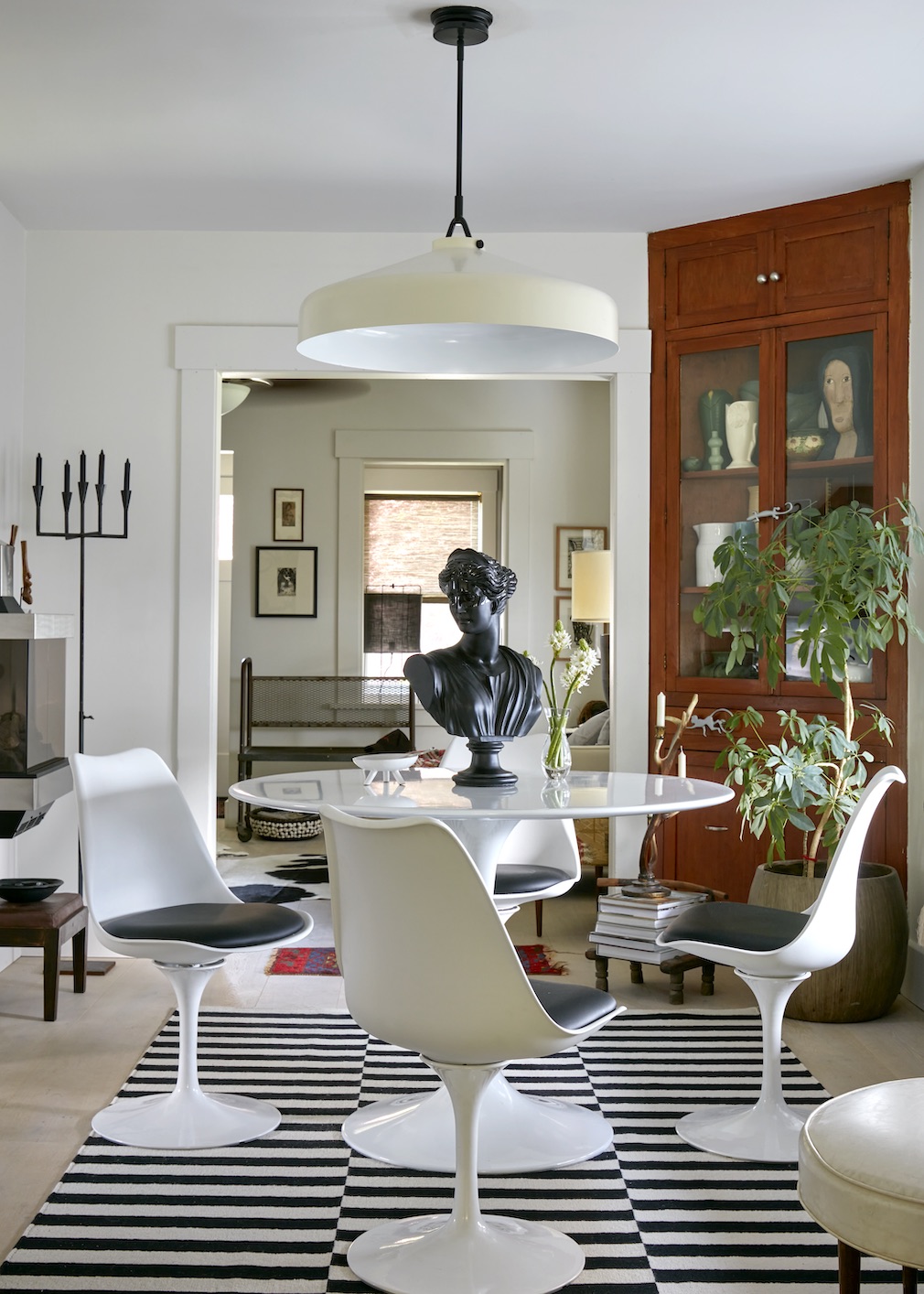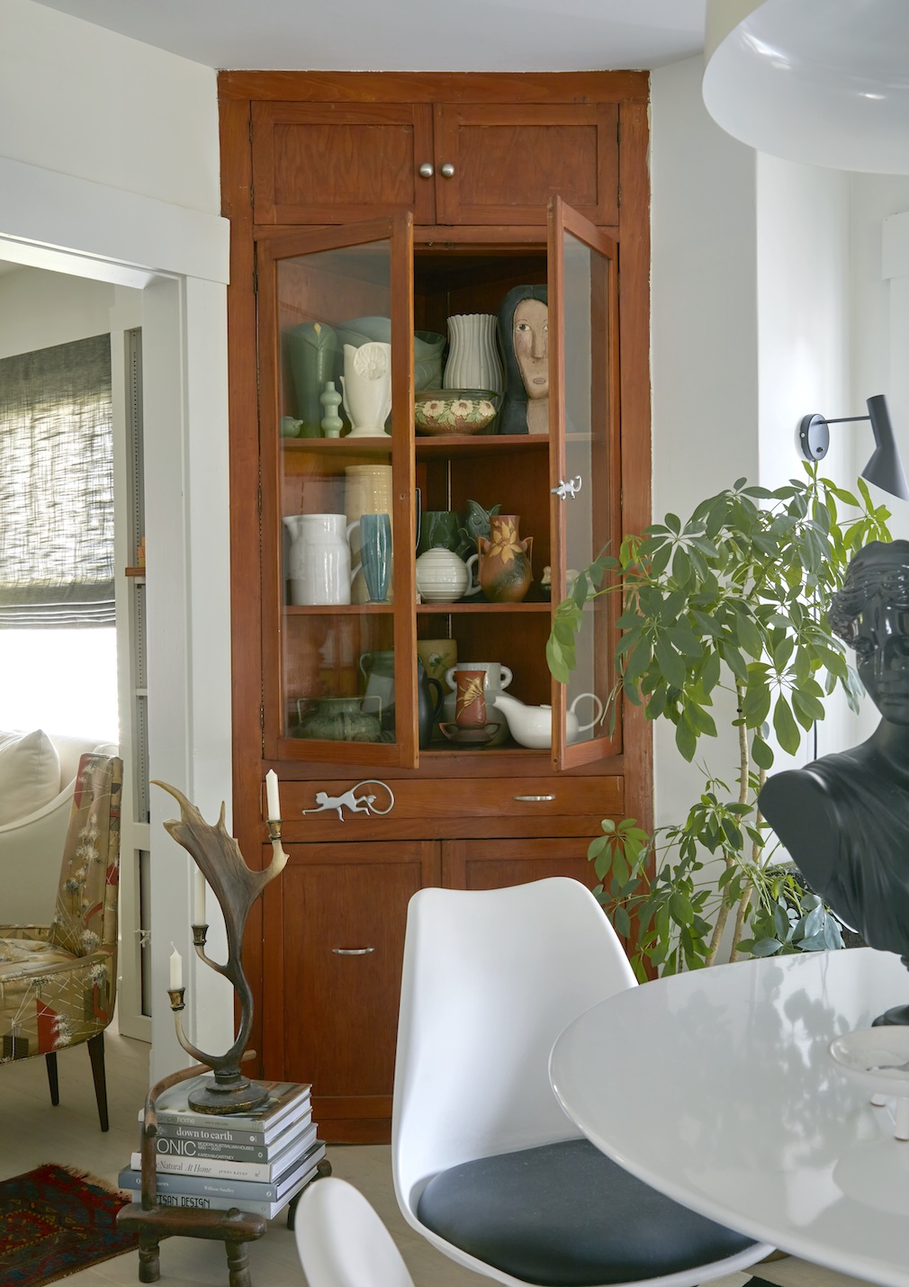 Original, built-in corner hutch with pottery collection; Area rug: IKEA; Saarinen Tulip Dining Table and side chairs; Pendant light: CB2; Vintage midcentury Yin and Yang puzzle bench.
