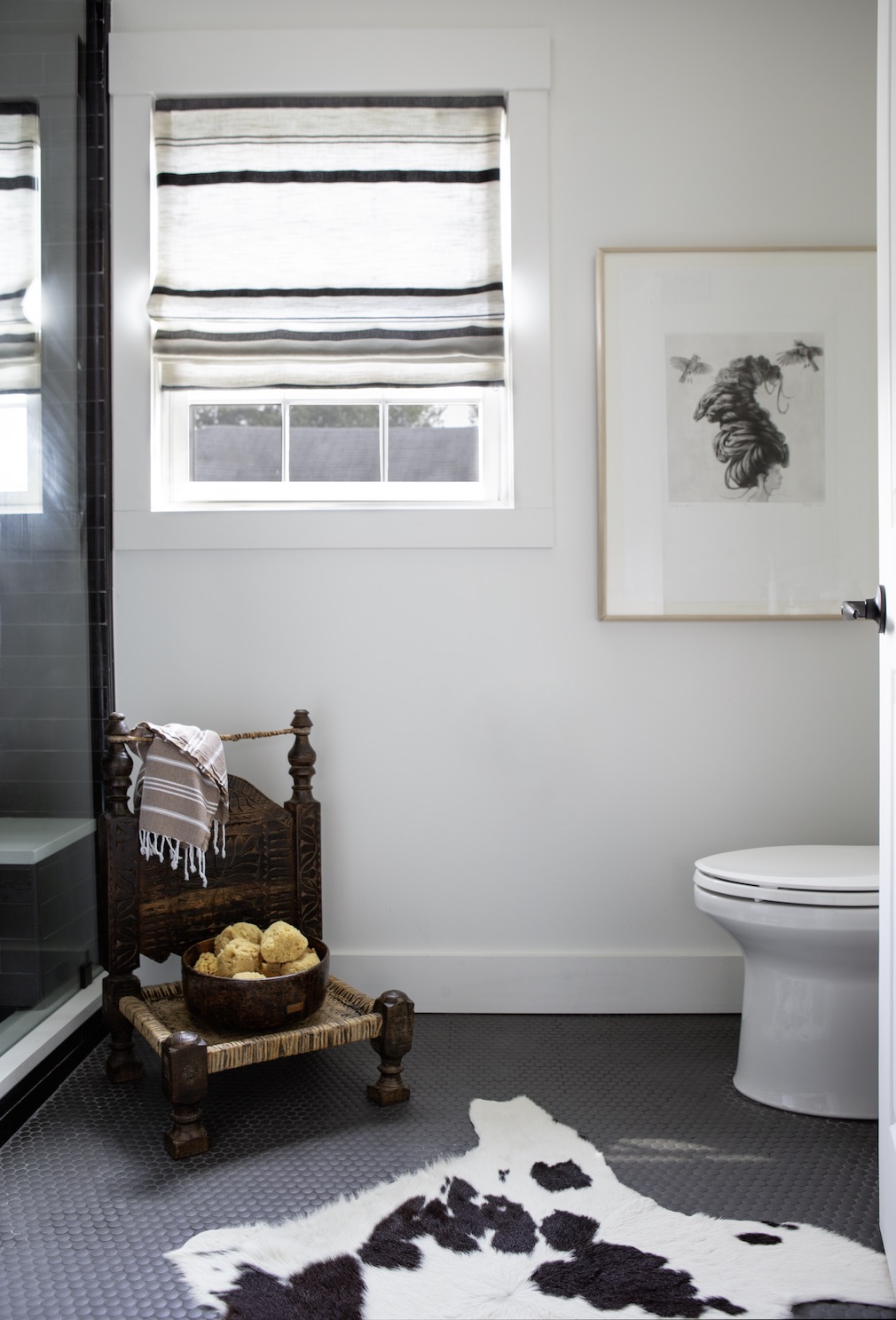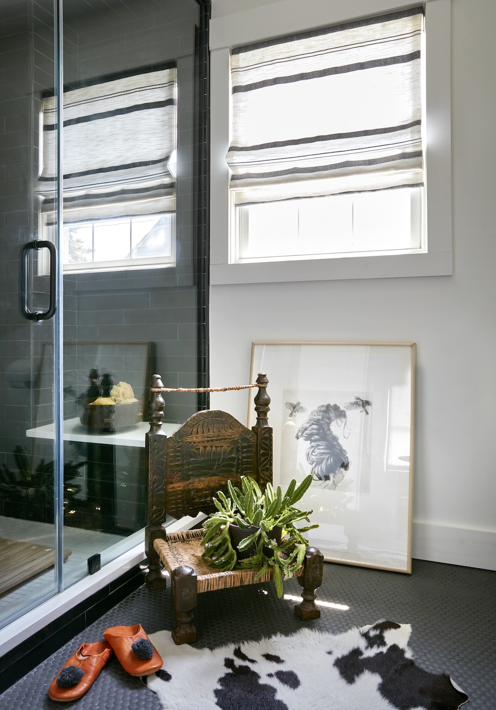 The original kitchen was converted into a bathroom. Steam shower hardware, vanity, medicine cabinet, and toilet: Kohler from General Plumbing Supply; Polished porcelain shower tile: Cavallo from Tilebar; Roman shade: The Shade Store; Early-20th-century hand-carved low cedar chair: Nuristan region of Afghanistan.