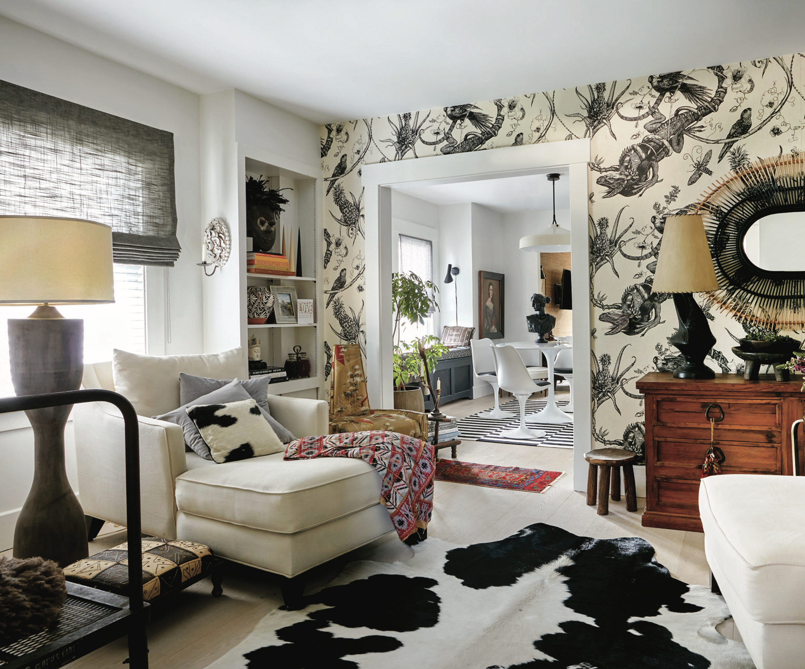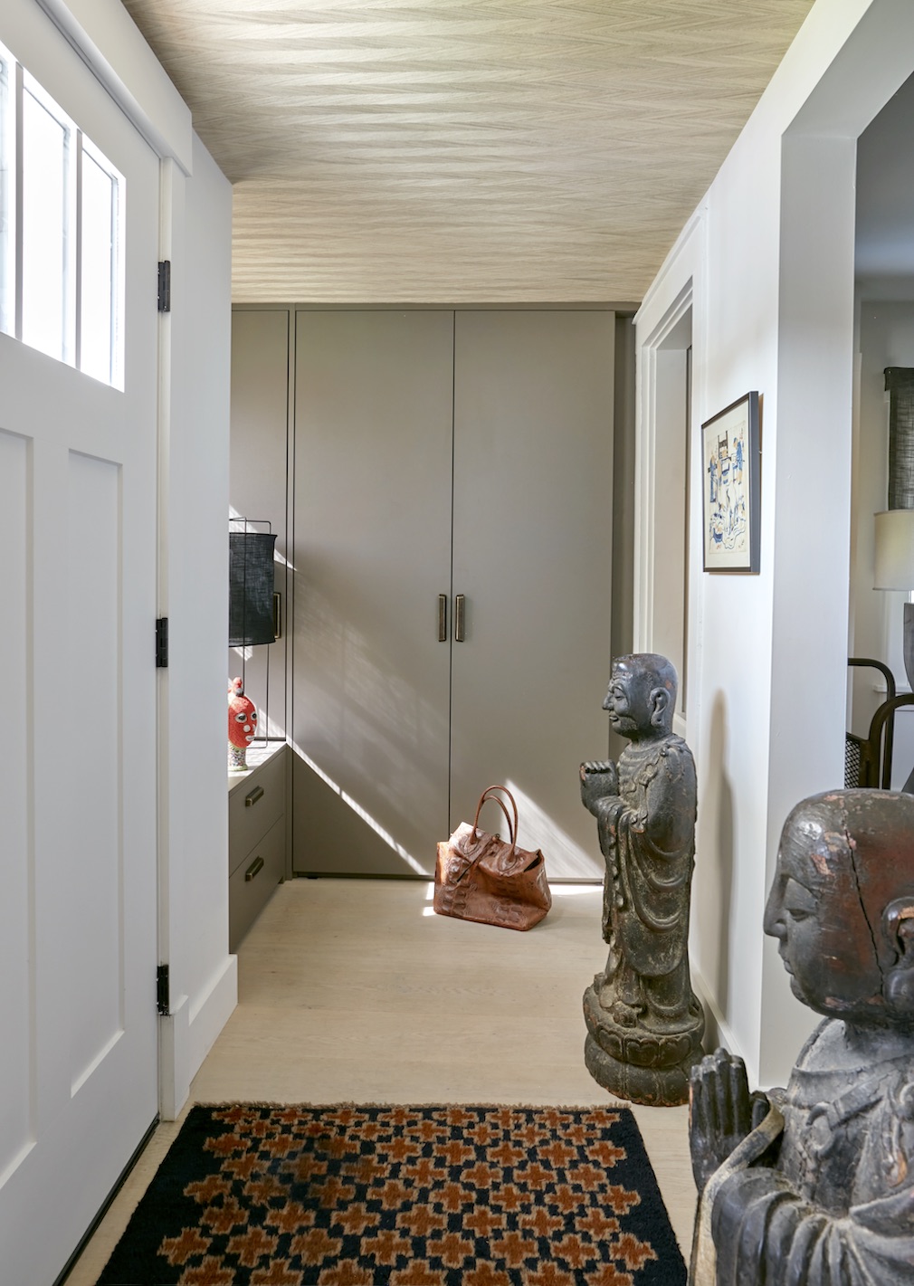 Hazelnut laminate cabinetry: Florense; Oak Character Deep White natured floor Planks: Mafi; Beige Bamboo wallpaper: Phillip Jeffries’ Peak Chic Collection; 18th-century carved monks; Moroccan area rug: Newburgh Vintage Emporium; Beaded African head: Diana Garreau in Laguna Beach, Ca; Linen lamp: Hendley & Co; Chantilly Lace Paint by Benjamin Moore.