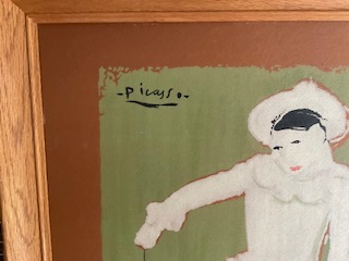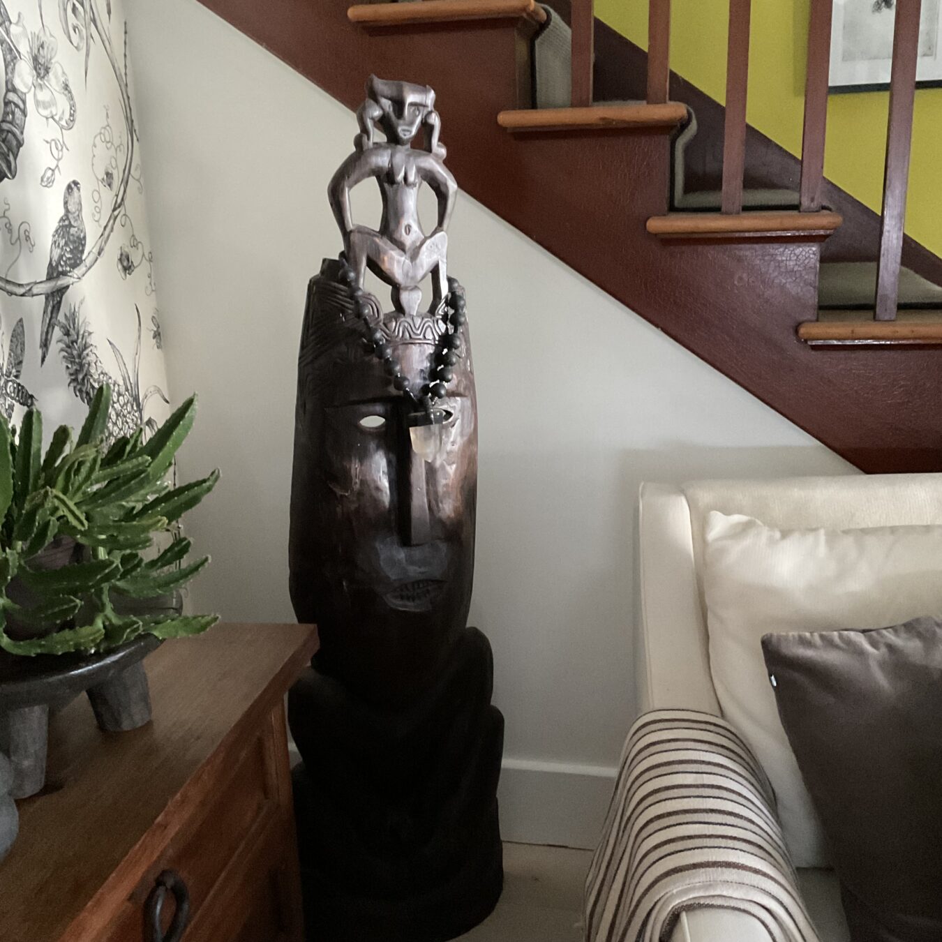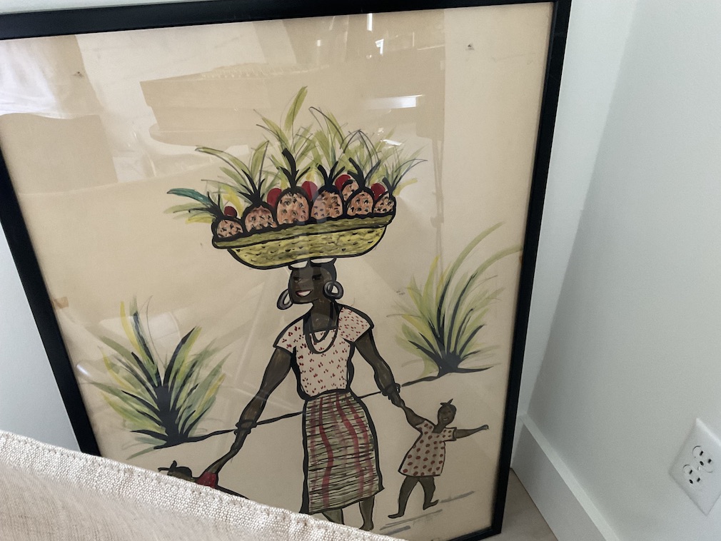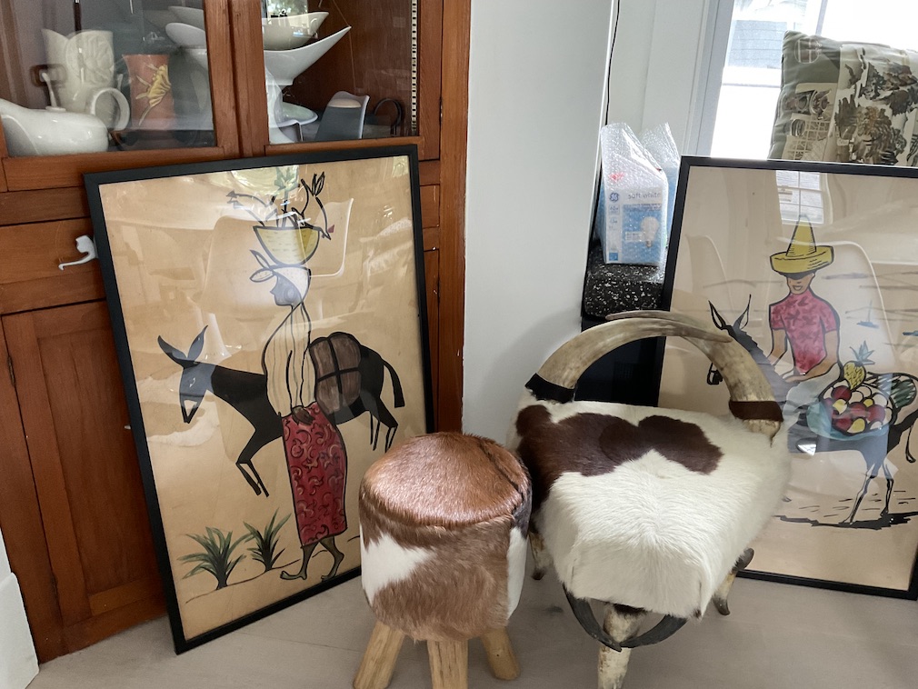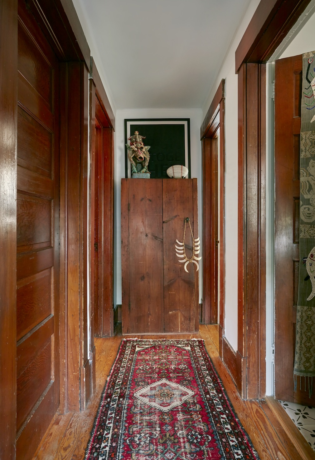 Upstairs we kept all of the original woodwork. My grandmother’s runner; Primitive cabinet; Mexican folk sculpture; “Get Your Shit Together” art: John O’Hara; Embossed serigraph: Forsyth.
