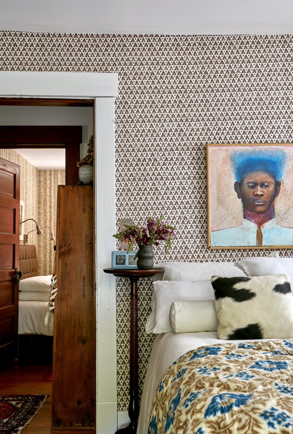 A door leads to the deck in this bedroom. French coverlet: Tinker and Nidge, Narrowsburg, NY; Portrait: arist Linda Hiwot; Volpi wallpaper: Quadrille; Yoshitomo Nara Walk On Flip Clock.