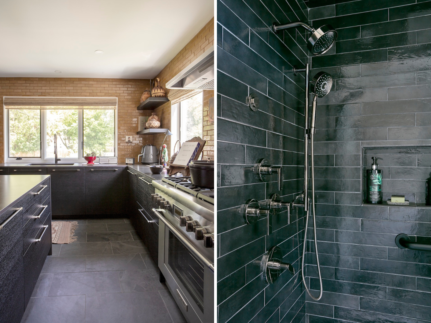 Kitchen: Moderna black lacquered oak finish integrated cabinetry: Florense; Countertops and island waterfall: Calatorao Matte Sintered Stone: Neolith; Appliances: Thermador, Reno’s Appliance, Paterson, NJ; Kitchen sink and faucet: General Plumbing Supply. Bathroom: Steam shower hardware, vanity, medicine cabinet, and toilet: Kohler from General Plumbing Supply.