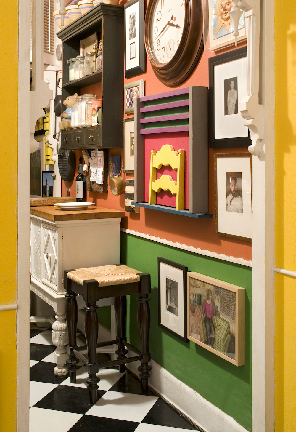 “I always liked the pumpkin yellow that interior designer Mario Buatta used on the walls in his apartment, so my living room walls became pumpkin yellow,” says Strohl. He chose deep green for the bedroom and multiple colors for the kitchen, a vision inspired by a room in the 1990 movie “Havana,” starring Robert Redford.