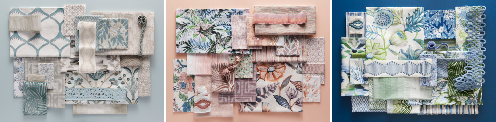 The collection has been curated into three books (left to right): Crystal Spring (neutrals + soft blues), Daybreak (violets + pinks), and Sapphire Forest (blues + greens).