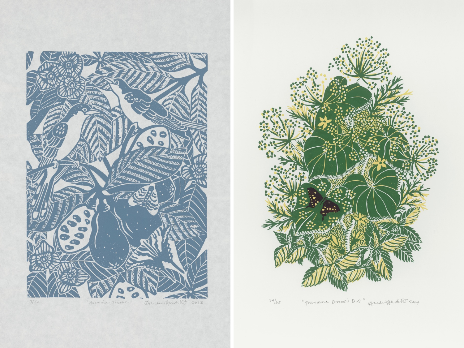 AA: I find my inspiration in contemporary nature writing. For example, I created my design Pawpaw and its sibling linocut print, Asimina Triloba, after reading Andew Moore’s 2015 book Pawpaw: In Search of America’s Forgotten Fruit. Moore’s book is a captivating exploration of why pawpaws are deeply rooted in American folklore, but nowhere to be found in American supermarkets. After a plant has captured my imagination, I gather imagery and start sketching. Next, I organize my sketches into a repeating pattern and transfer them onto blocks. I use rubberized blocks that have a similar mark to linoleum, but they’re much easier to carve. The number of blocks depends on the size of the repeat and whether I’m adding color post-production (as was the case with Pawpaw) or adding it through a multi-block printing process. Then I carve the blocks, ink them, and print them. For polychromatic designs that require multiple blocks, registration is everything!