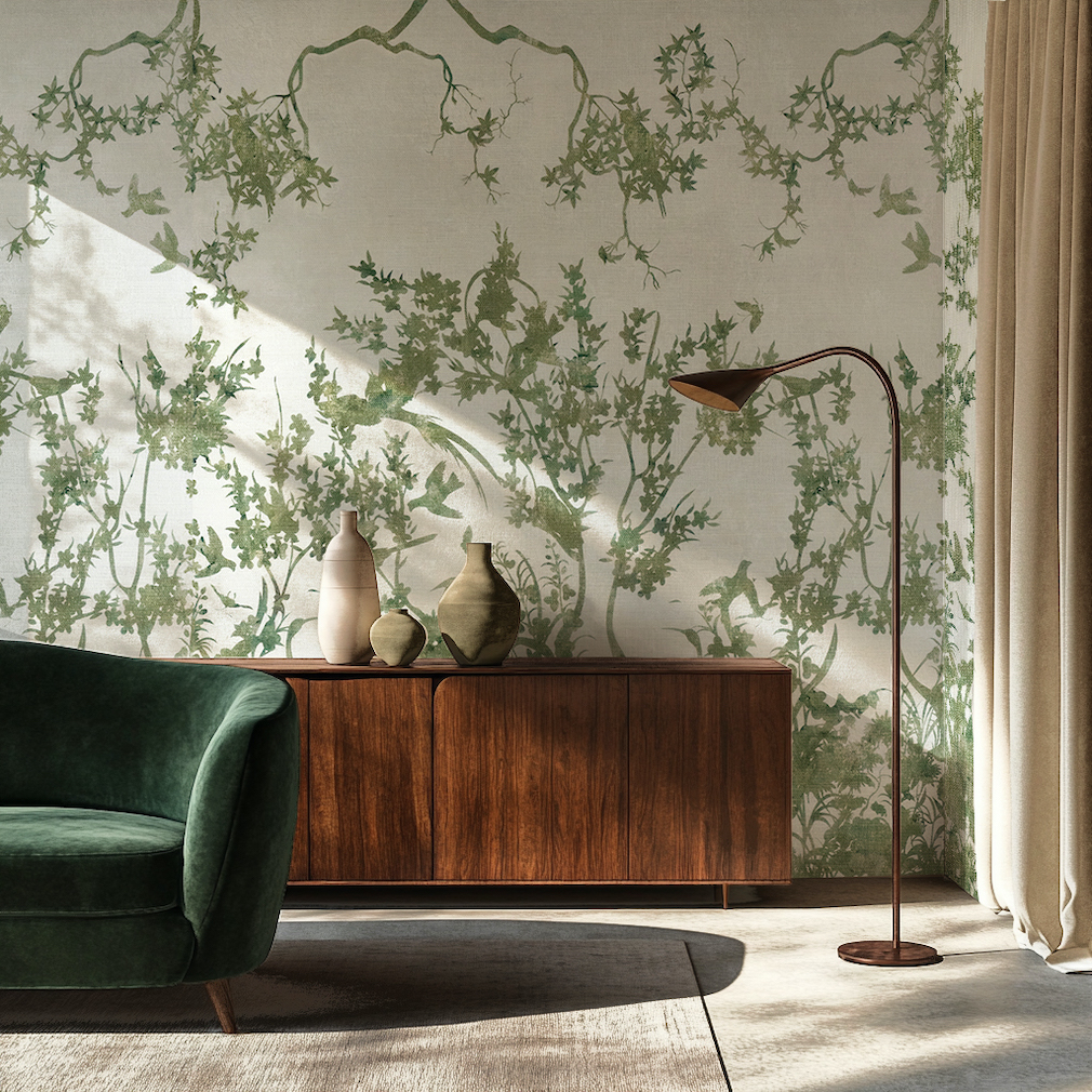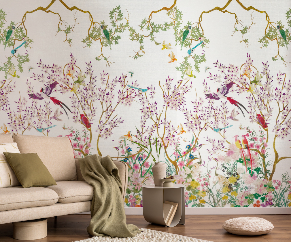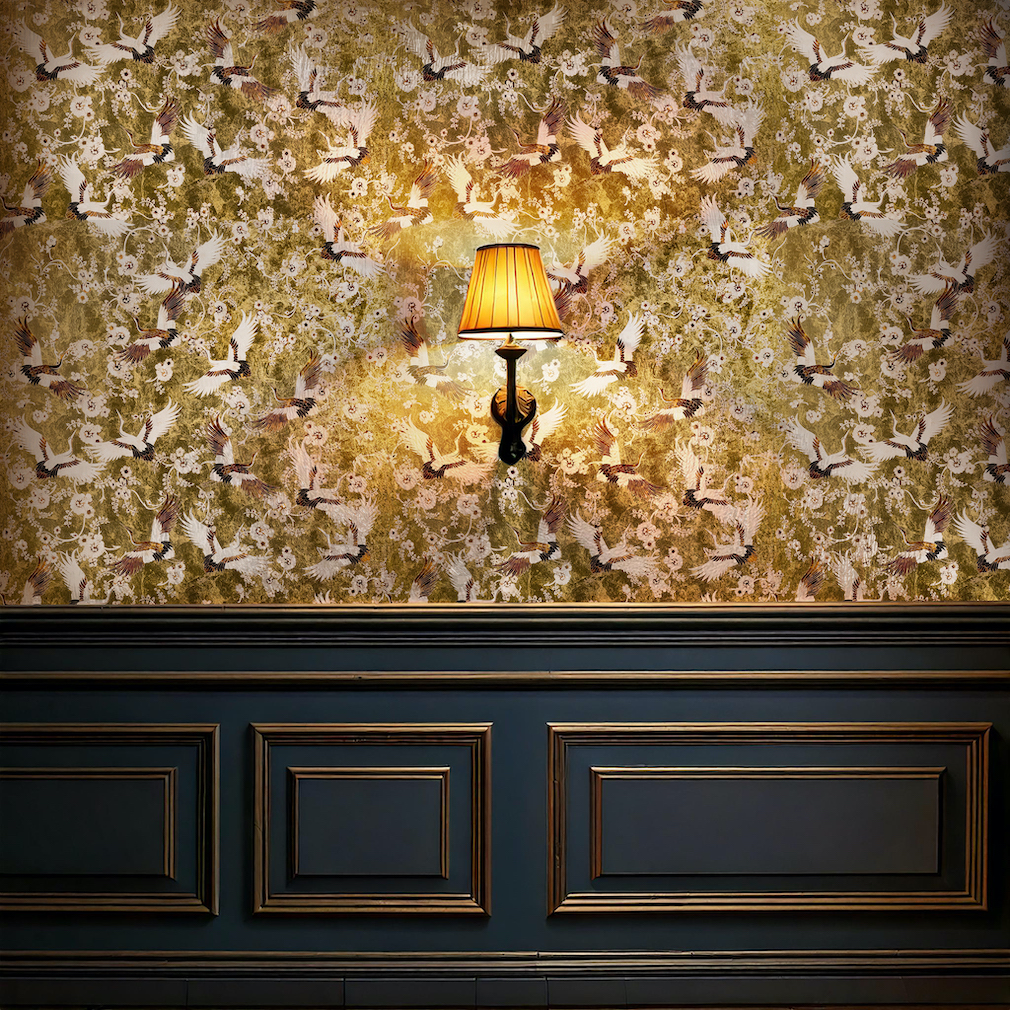 WM: My inspiration is deeply rooted in Eastern philosophies, their harmony with nature, and the enchanting world of flora and fauna. As a rug designer, I bring my artwork to life through yarn and texture. With this collaboration, it was Parete that translated those narratives onto walls, through exquisite materials like gold foil, grasscloth, and silk. It was the perfect union of my love for storytelling, craftsmanship, and nature.