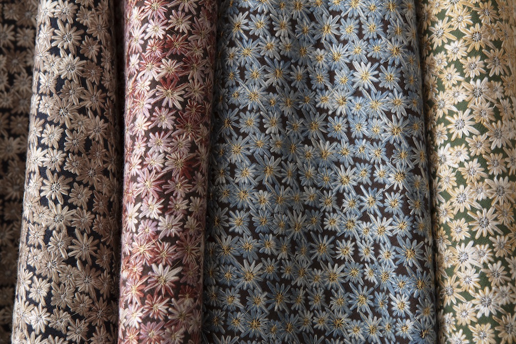 Persephone is the most traditional floral since it’s based on an antique French document. Charlotta is a much simpler flower and slightly masculine as the petals reference shields or crests. It’s even more interesting because we combined a handblock print with machine embroidery. Corsage uses a beautiful space-dyed yarn to give a multicolored look to fine flowers with a pinpoint of metallic Lurex at the center. The embroidered flowers are so dense that they almost entirely cover the ground cloth.