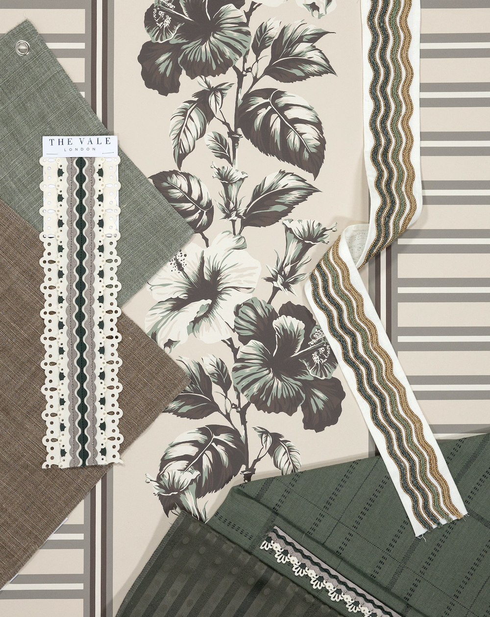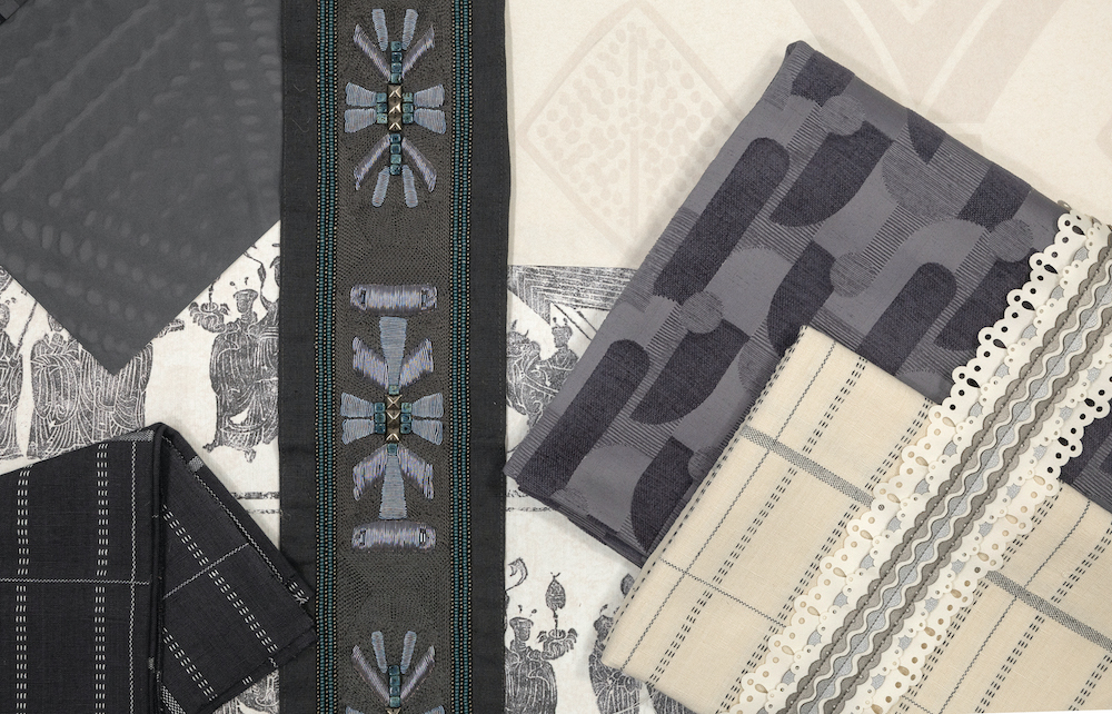 From left to right: Butabu in Obsidian, Farrah Trim in Silver, Adobe in Parchment, Mademoiselle Trim in Silver, Kylian Check in Parchment, Han Wallpaper in Obsidian and Kylian Check in Obsidian.