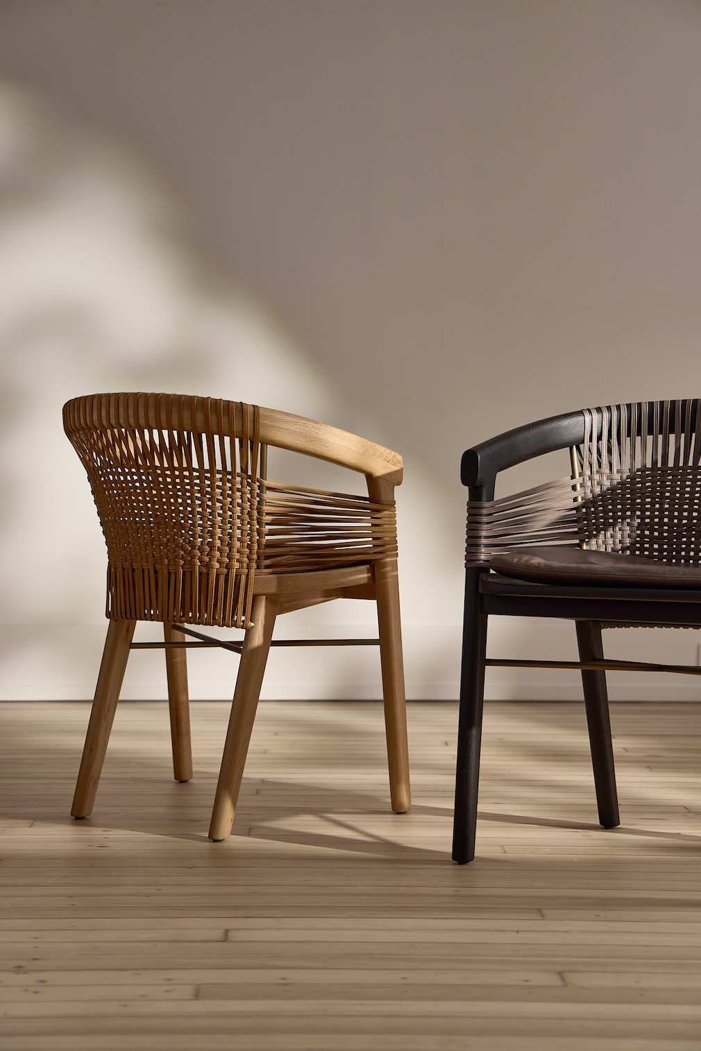 The Entwine dining chair, shown in Natural/Chestnut and Ebonized/Charcoal finishes.