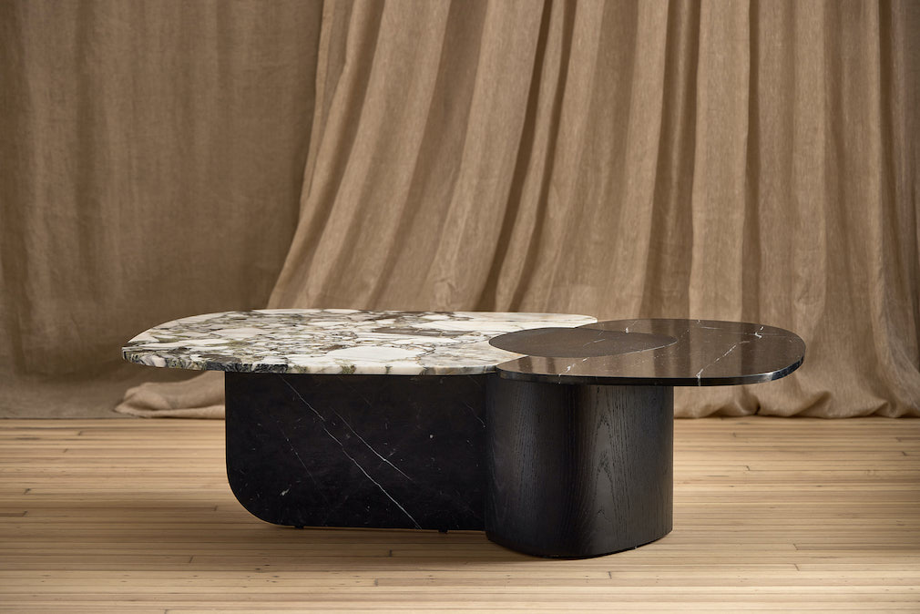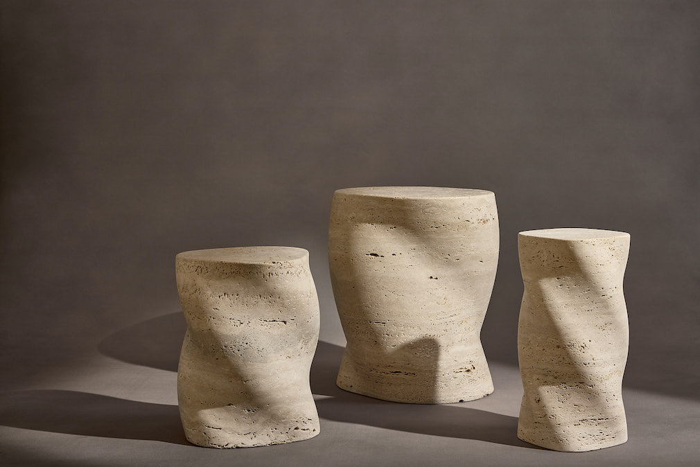 The Twist tables hold gravity with seamless forms rendered in solid limestone or travertine.