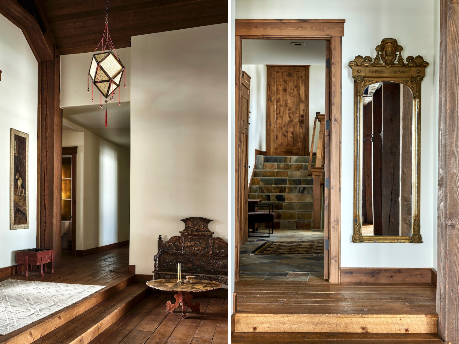 The abundance of wood in the house generates a warm, cocooning effect. Still, there’s nothing traditionally lodge-like about these spaces, thanks to the way Michaelson has incorporated European antiques throughout. A Fortuny lantern is suspended in the foyer. A vintage pier mirror made of brass hangs parallel to a doorway that frames a short staircase spun of slate tiles in an almost mossy hue. The Cabrera waxed-concrete dining table from RH is surrounded by gilt-kissed, 19th-century Italian chairs sourced from an antique dealer in Toulouse. The primary bedroom sports red leather Poltrona Frau Boheme chairs and a custom headboard made from an antique valance, which is newly upholstered in Annata velvet from Quintus with Samuel & Sons trim.