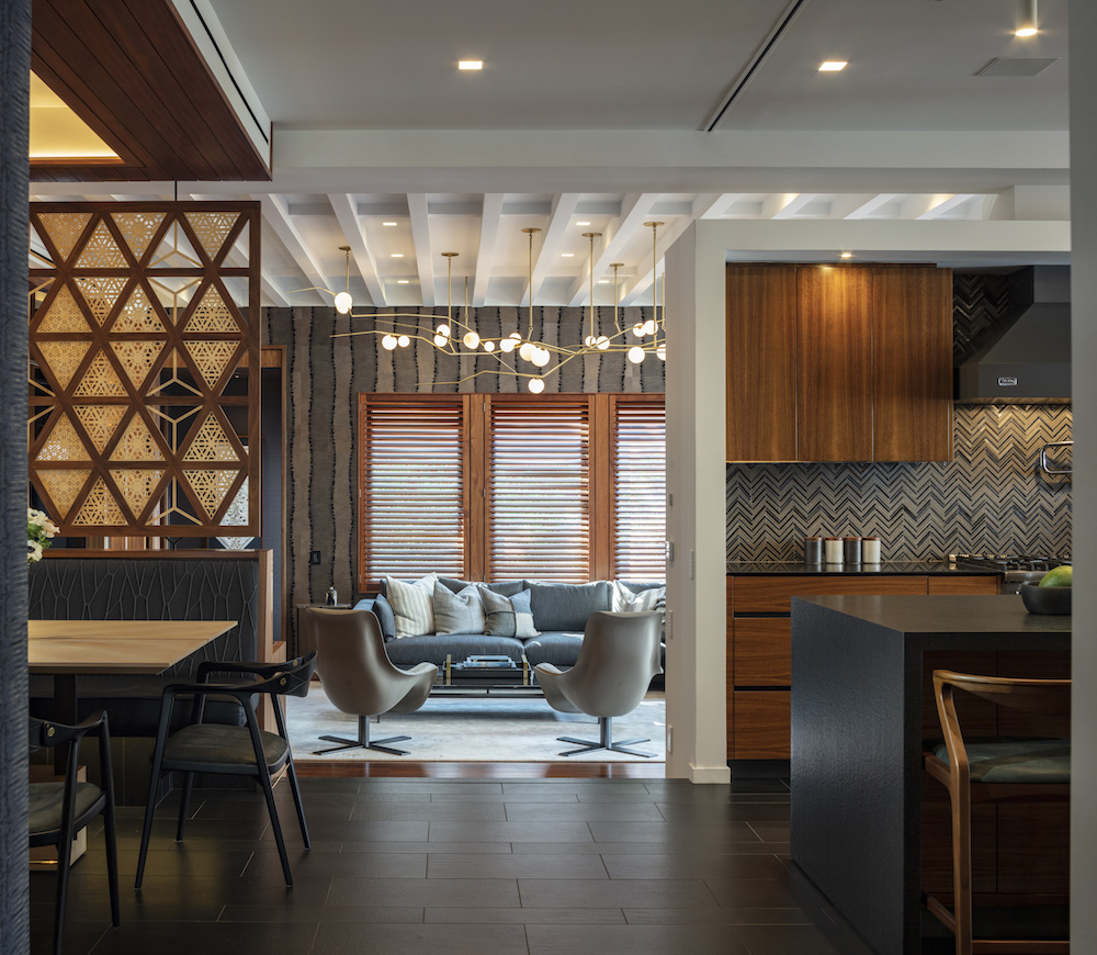The banquette-lined dining area of the kitchen is separated from the adjacent family room by a screen that ends just short of the ceiling. In the dining room, the table (solid American walnut slab with live edge) sits on an expanse of solid walnut bordered by Absolute Black granite tiles.