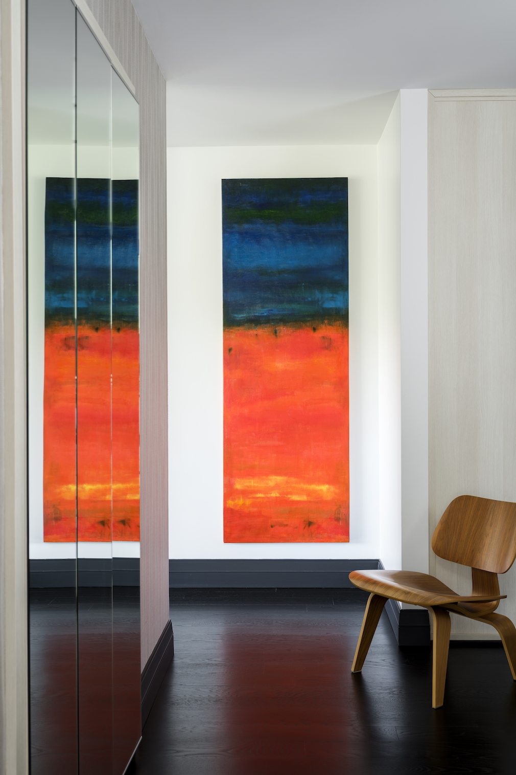 Originally, Tran and the client envisioned buying art and searched showrooms and galleries. But they couldn’t find pieces that were of the correct scale and color, so she asked Tran to paint them. “The works either coordinate or contrast with the furniture, depending on what effect I wanted to achieve,” he describes.