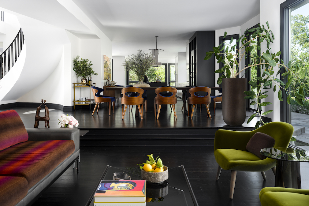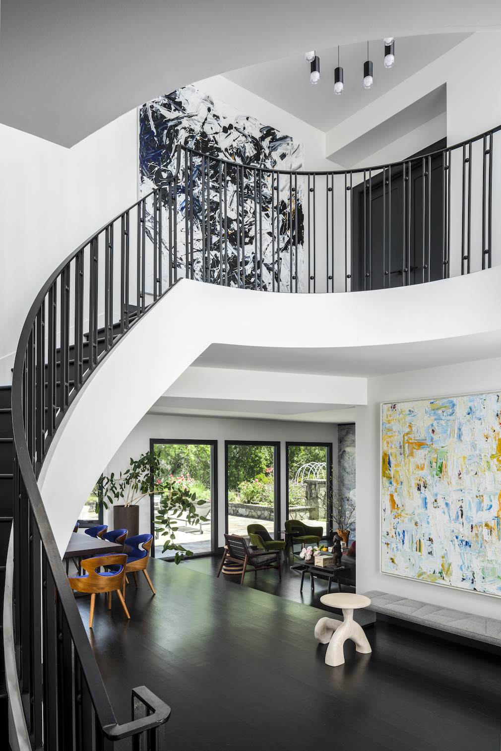 To create drama, Tran painted the walls white and the floors, window casings and door trim black, then added large abstract paintings for jolts of color. “With my design, I don’t like to be predictable,” he explains. “And in this case, I had a big-picture vision. But the client was flexible, so some things were not planned out on paper; they just happened.”