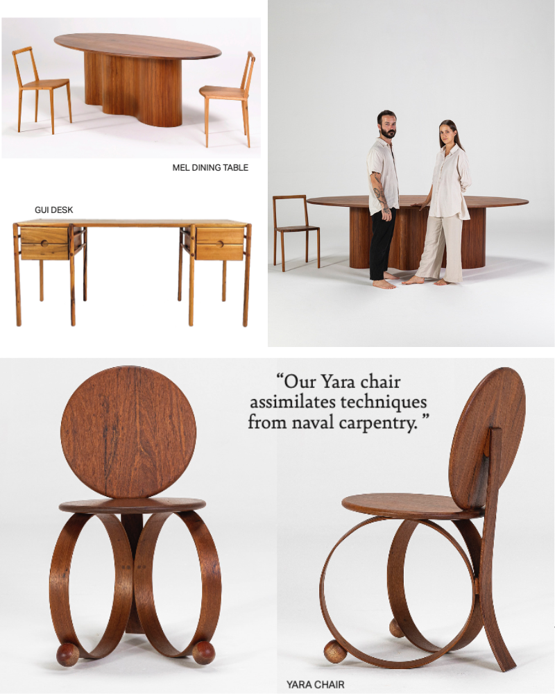 “Our main source of inspiration is technique,” claims Júlia Rovigo, principal with Gabriel Pesca of Prosa. “Most of our techniques come from naval carpentry.” Their Yara chair, for instance, “was created from a pile of scraps of failed attempts at steam-bending.” The chair looks like a cross between the secessionists (the ball feet and rounded shapes recall Josef Hoffmann) and midcentury modernists Charles and Ray Eames.