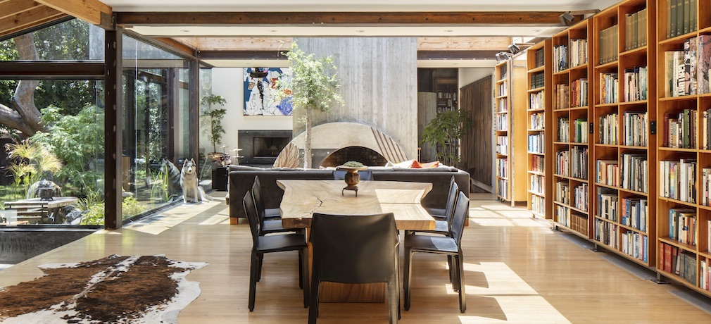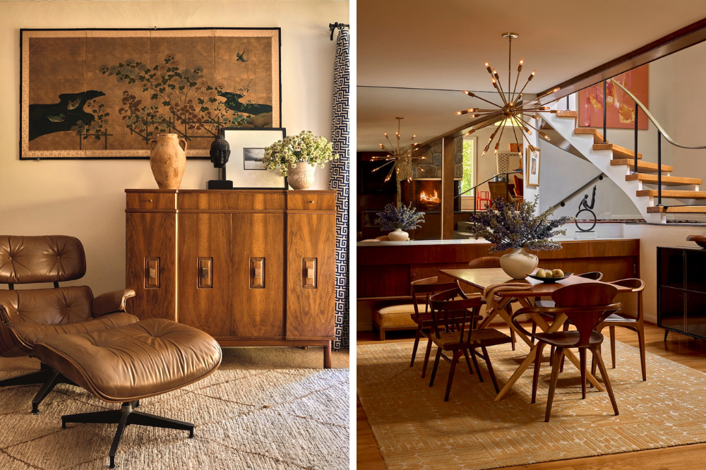 This goes double in the den, where the original walnut paneling now keeps company with a Jonathan Adler Desmond screen divider, and one can kick back on an Emmy sofa from Design Within Reach and set a drink down on a classic Richard Schultz Petal Table from Knoll. A casualness pervades the dining room, too. Framed at one end by a mirrored wall and built-in sideboard made of walnut, the table is surrounded by two Norman Cherner chairs, two George Nakashima grass-seat chairs and a pair of anonymous walnut chairs.