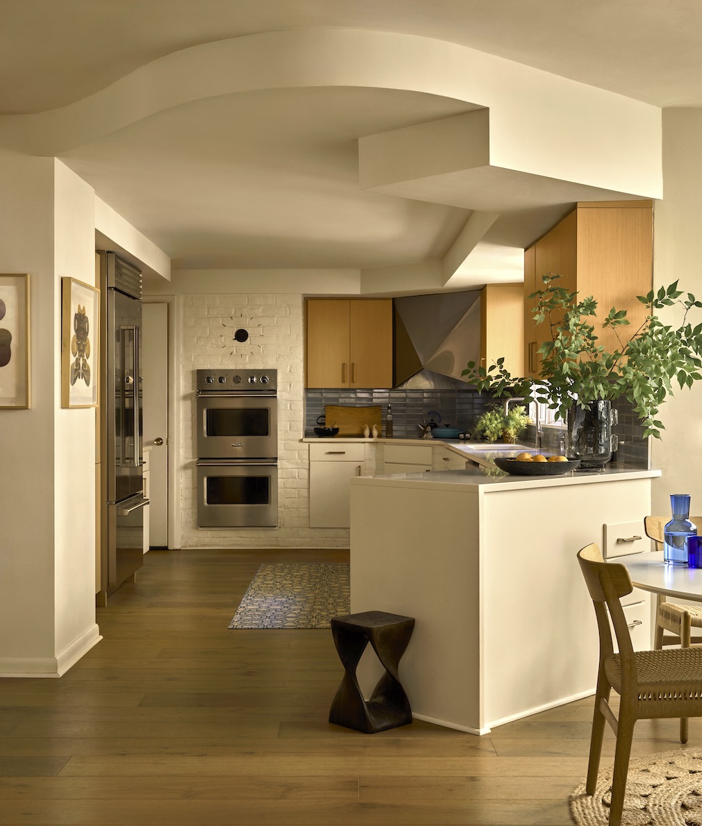 The relatively compact, open-plan kitchen, which the homeowners spruced up with the addition of a built-in pantry, new quartz counters, custom cabinets and wide-plank European oak floors, still sports such Space Age features as a wall clock attached to the brick that surrounds the wall-mounted ovens.