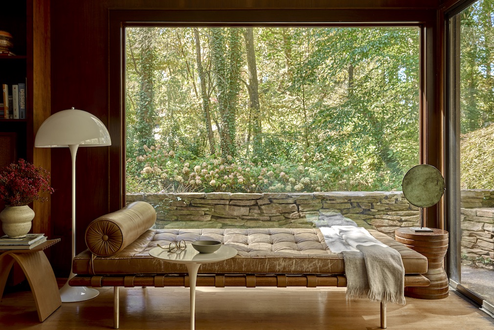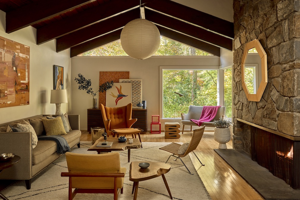 Over time, the couple – avid collectors of vintage and modern furniture and art – added to their holdings to outfit the house. A Hans Wegner settee, George Nakashima coffee table, and Frank Gehry Wiggle Stool are all at home in the living room, where the pitched ceiling is strung with beams of Douglas fir and the wall-filling fireplace is clad in Pennsylvania flagstone. “I definitely don’t like clutter,” shares Marrone, whose go-to sources include 1stDibs, Artnet and Chairish. “But I do enjoy collecting, so am now at a point where if something is coming in, something else is going out.”