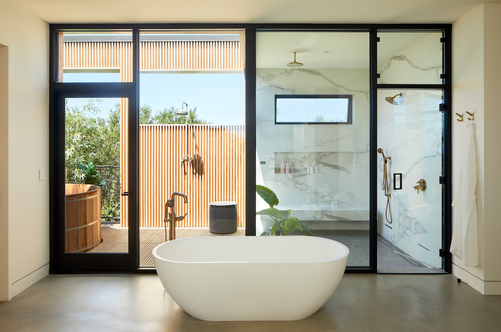 The architecture wholly embraces open living with the dynamic interplay between inside and out, Hefner explains. “There’s a covered pergola off the kitchen for shaded and heated dining, both day and night. Recessed seating arranged around the pool and pocket sliding doors make certain portions of the house truly indoor/outdoor.”