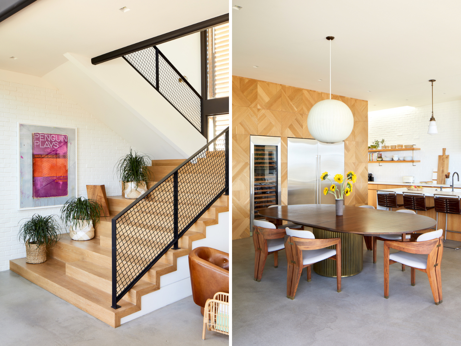 High ceilings, white walls, concrete floors and iron staircase railings all create a uniquely modernist home. Hefner’s favorite design element? “The two-story atrium space that connects the two wings of the house with a bridge that ties to the second-floor bedrooms.” The home embraces the warmth of wood in its design, right from the first glimpse. “We used a lot of cedar for wall cladding and decking on the exterior,” Hefner shares. “A sense of craft is important to us as a design element, and the home reflects that.”