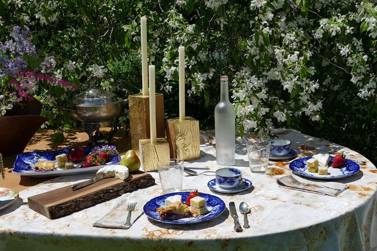 Hand poured beeswax tapers rest in artisan made candleholders – a perfect balance of dichotomous rusticity and pure luxe gold. Inspirational sounds and poetry readings relax the mind while dinner unfolds, to be served up in summer inspired Haiku bowls featuring poems and drawings by Harry D Hudson. The delicacy of blackberries, an artful frog and whimsical grasshoppers, crickets and dragonflies are embodiments of high summer on each ceramic serving and dining piece.