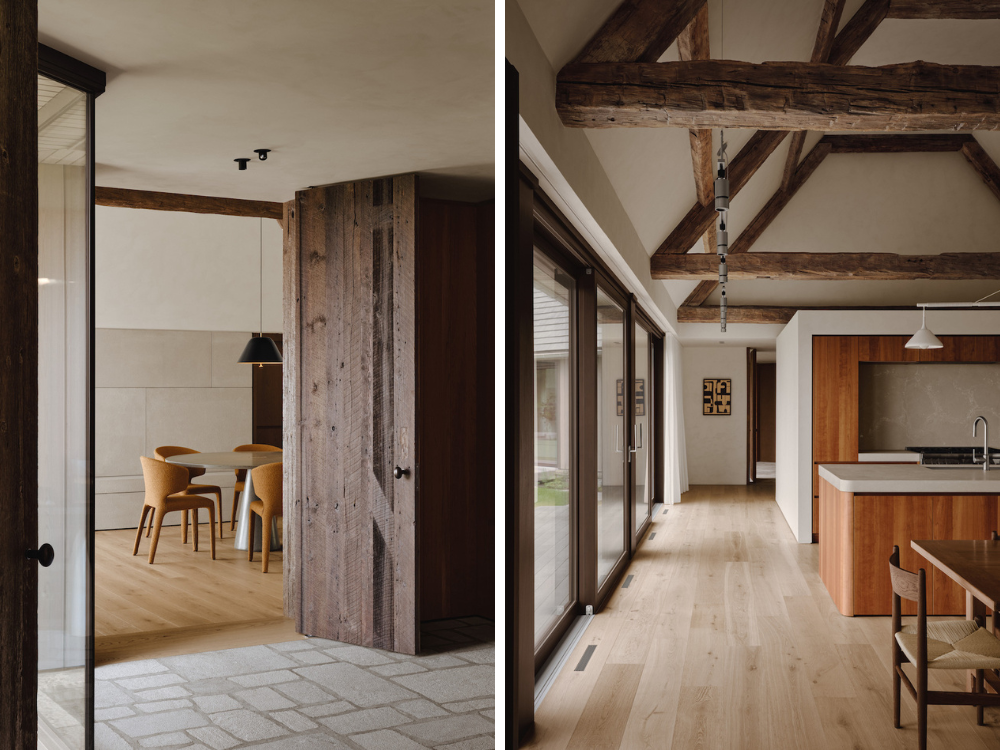 In plan, the spaces on the ground floor are organized in a continuous sequence, returning to a distribution of simple spaces where horizontality is prioritized, thus reflecting the landscape. Divided by large doors made of reclaimed wood, the plan offers fluidity to the spaces, despite the fragmentation of the volumes, which is perceptible from the outside. Most of the spaces on the ground floor are designed as cathedral volumes, with reclaimed beams adapted to the new structural constraints of the project.