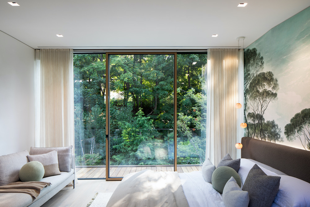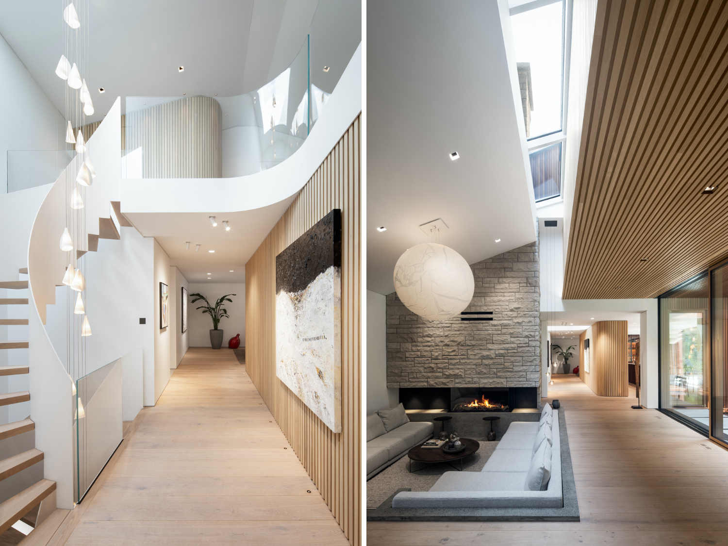 Inside, a harmonious blend of various natural materials such as oak, walnut, stone, marble, and Shou Sugi Ban burnt wood creates an elegant unity. Ceiling and floorings devoid of baseboards or moldings establish an airy elegance. Seamlessly integrated doors further enhance this streamlined aspect, while the interplay between straight and sinuous lines enlivens the space.